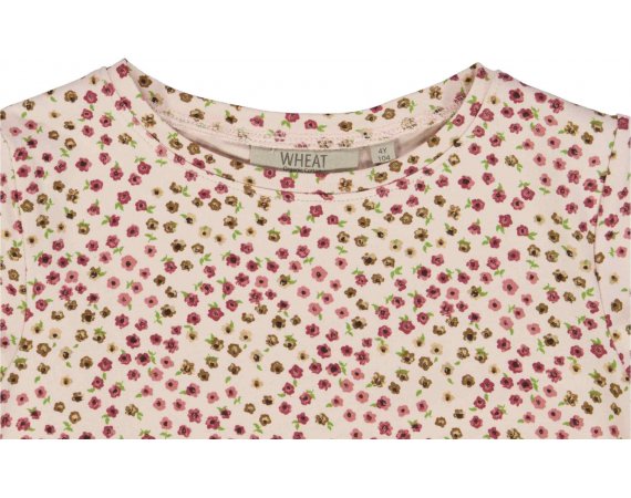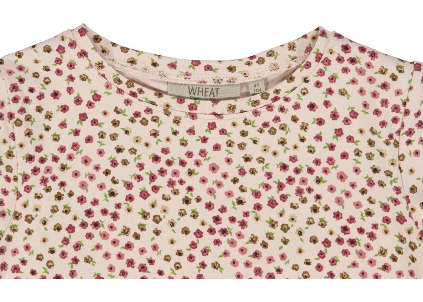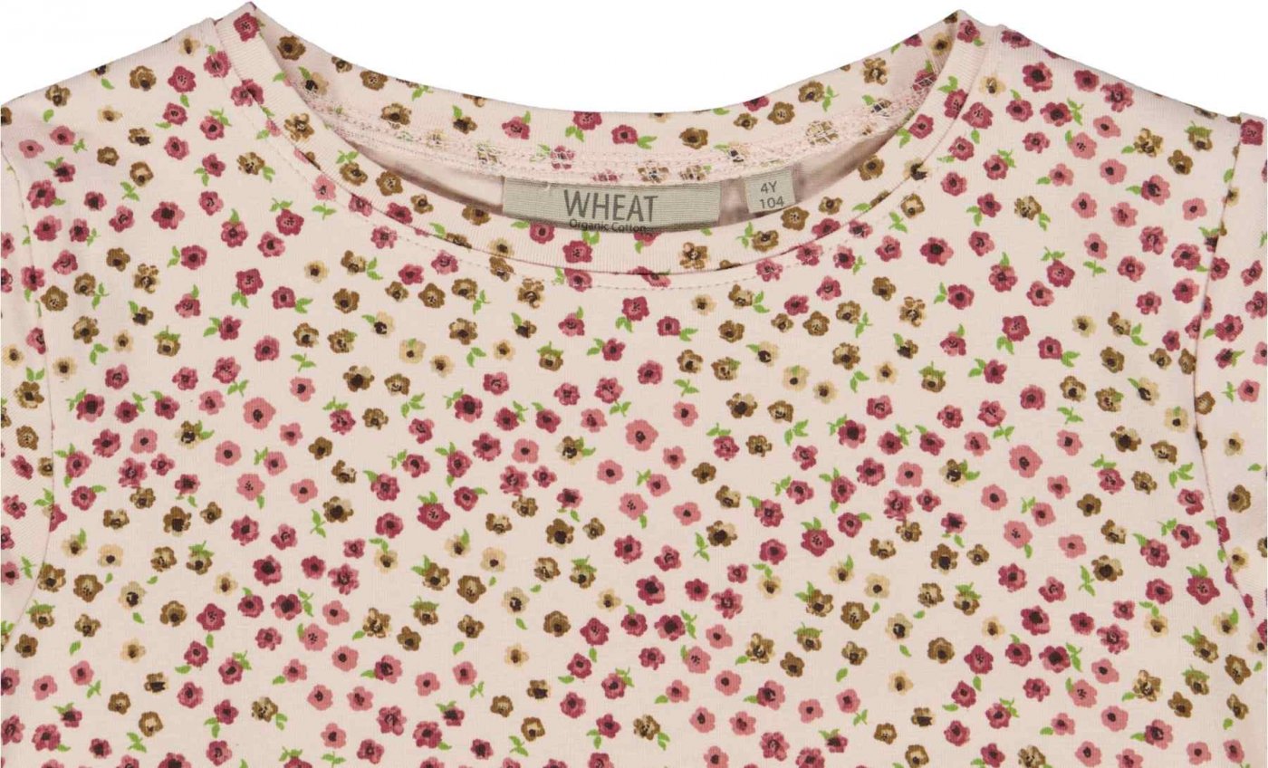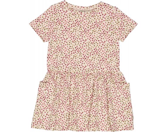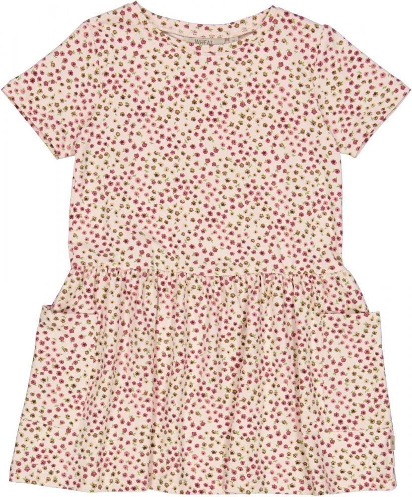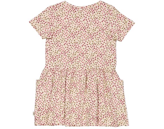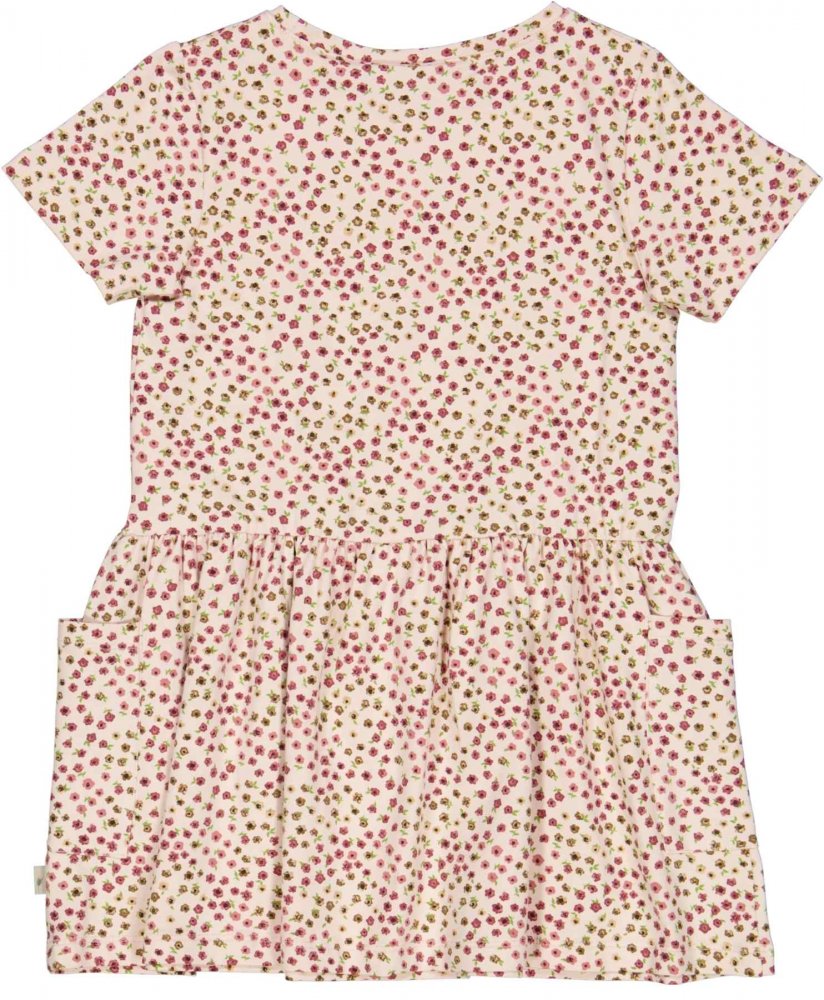 Lækker pudderfarvet kjole med søde blomster i blød økologisk bomuldsblanding.Kjolen er kortærmet, har overskæring med elastik i livet og rynk i skørtet, som giver den flot vidde.