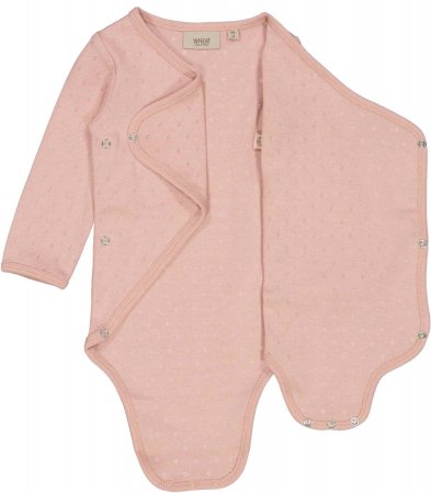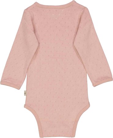 Lækker slå-om body i økologiske bomuld.Bodyen er strikket i et klassisk pointelle-strikmønster og har fine ribkanter i alle åbninger. Den har trykknapper og kan åbnes ellers lukkes foran i et kryds i begge sider. Den kan lukkes med trykknapper imellem ben.
