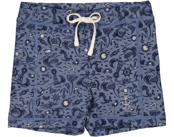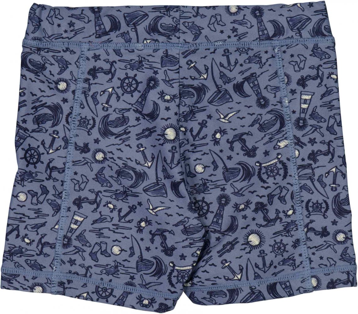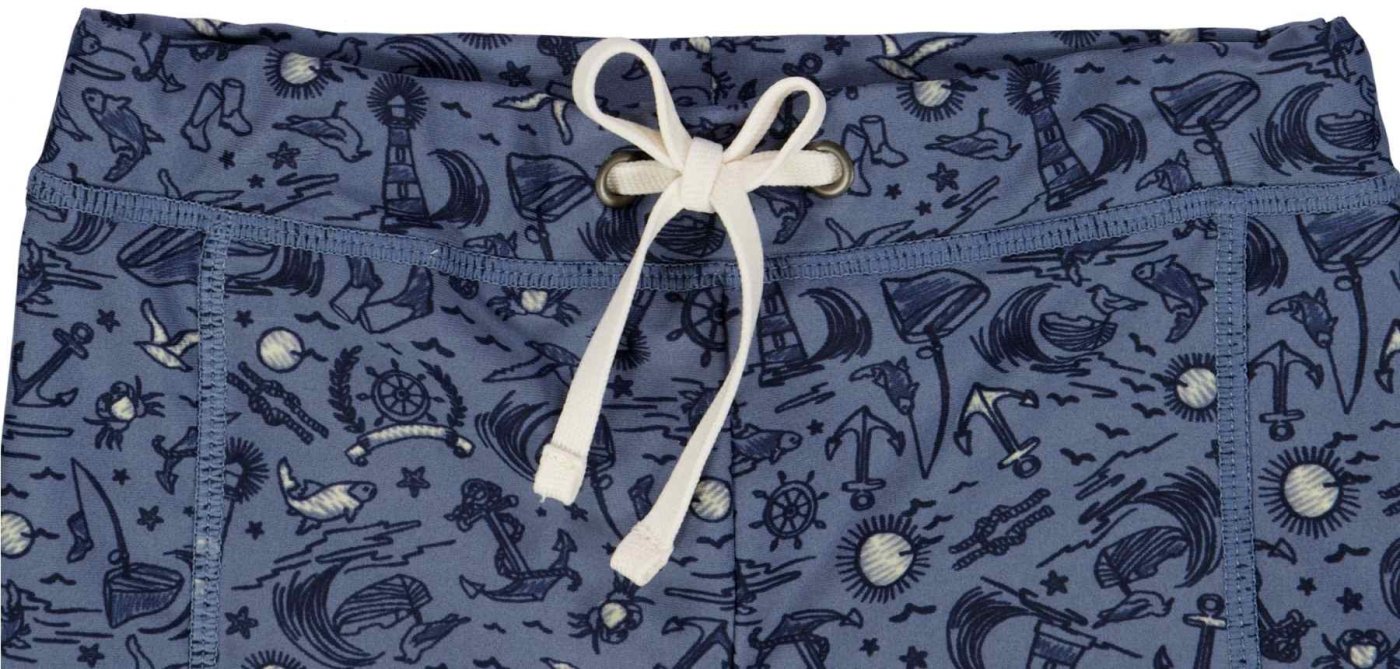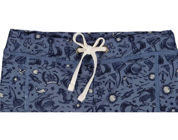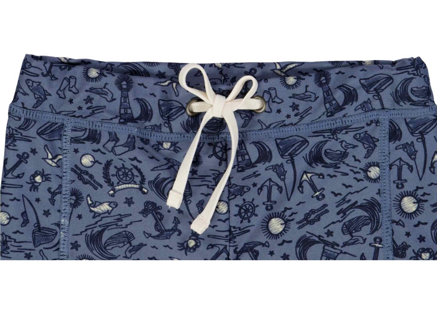 Flotte drenge badeshorts i blå med maritimt tema og UV 50+/UPF 50+ beskyttelse.Shortsen har bindebånd i talje.