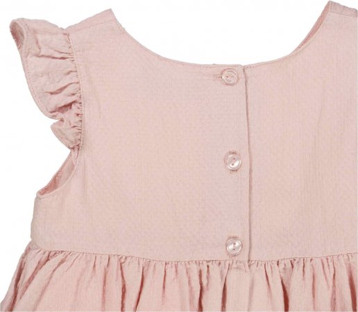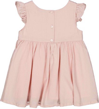 Sød kjole i rosa farve med prikker fra Wheat.Kjolen er uden ærmer og lavet i en skøn viskose- og bomuldsblanding. Den har flæsedetaljer på skuldre, er skåret over i talje og har læg, som giver flot fylde i skørtet. Kjolen har et tyndt bomuldsfoer og lukkes på ryggen med knapper.