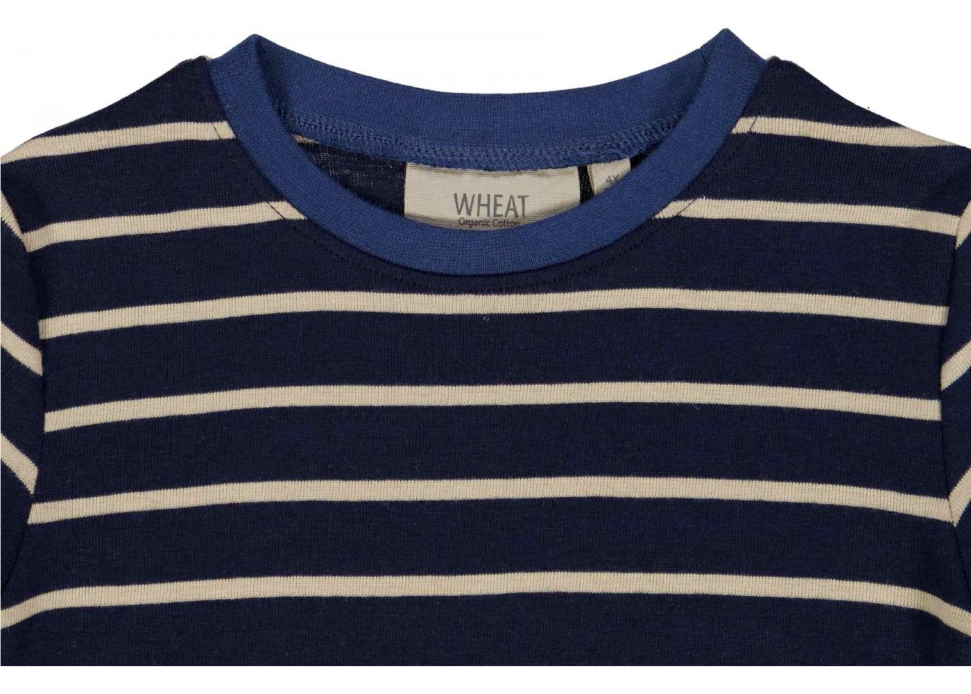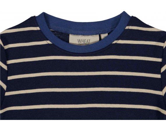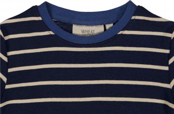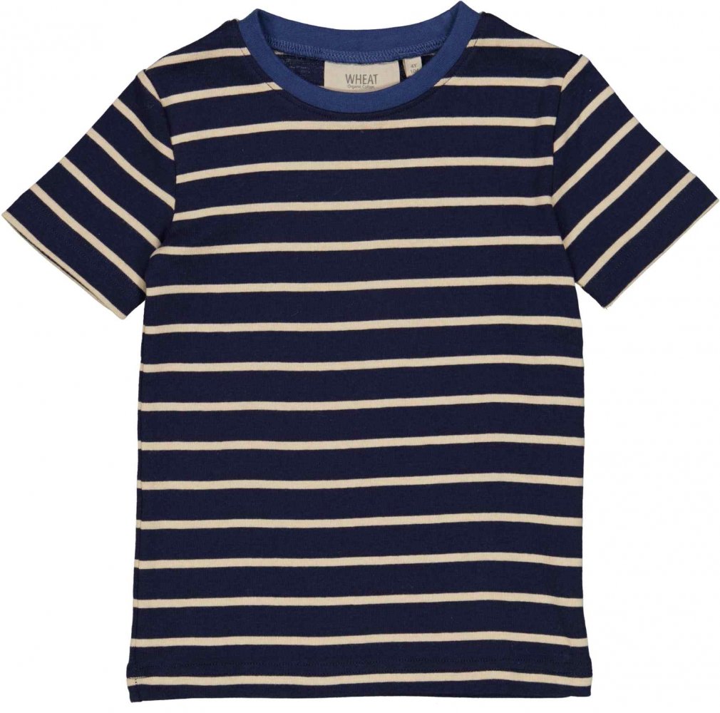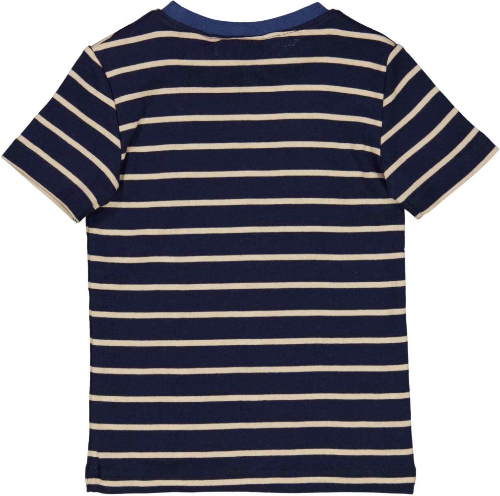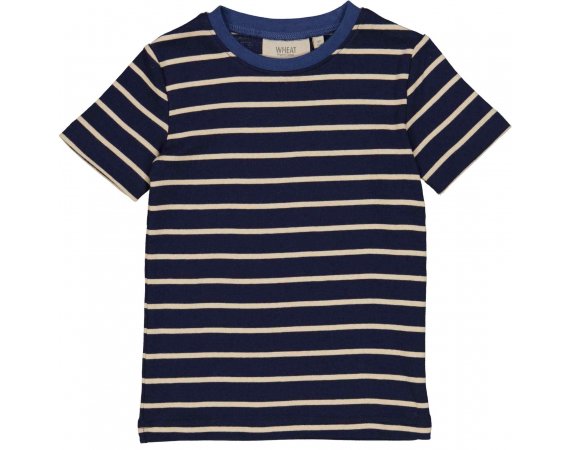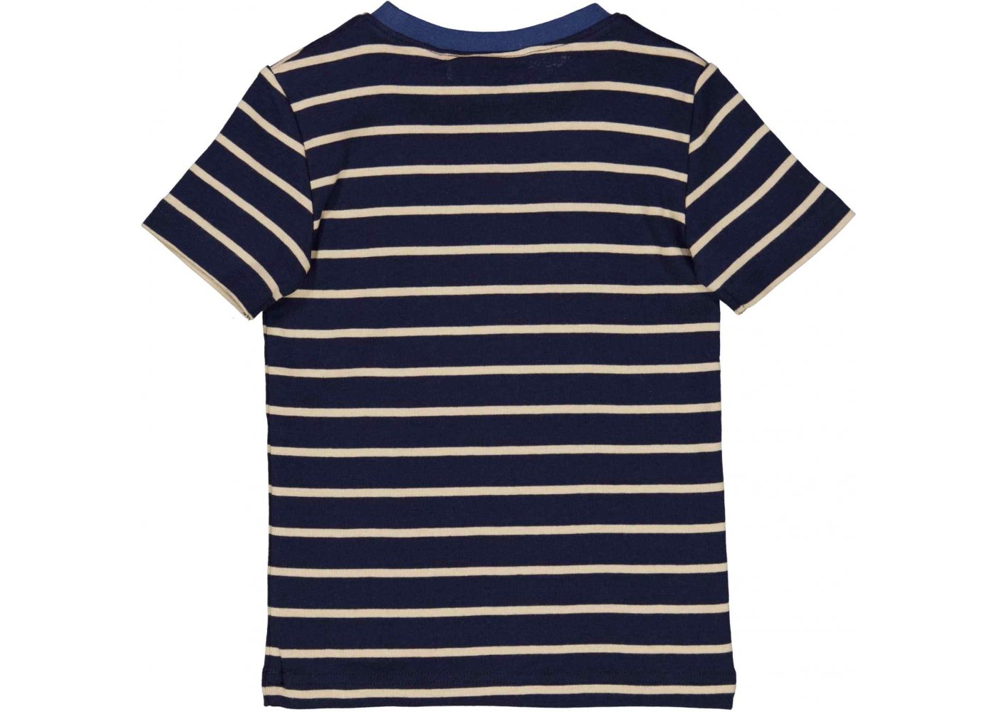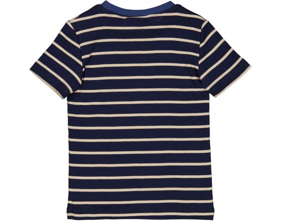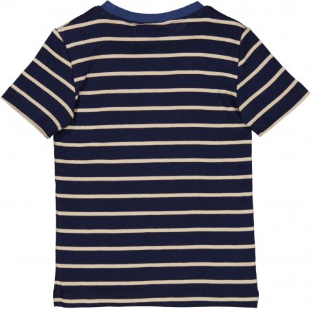 Smart, kortærmet hvid og blåstribet t-shirt med rund halsudskæring i blå kontrast farve.