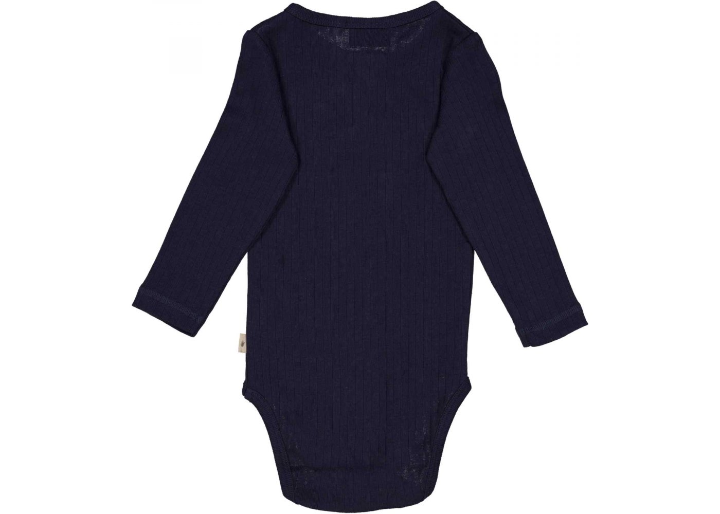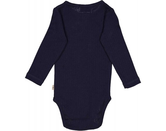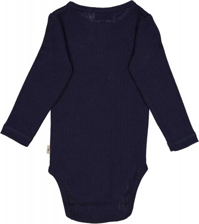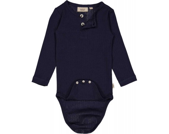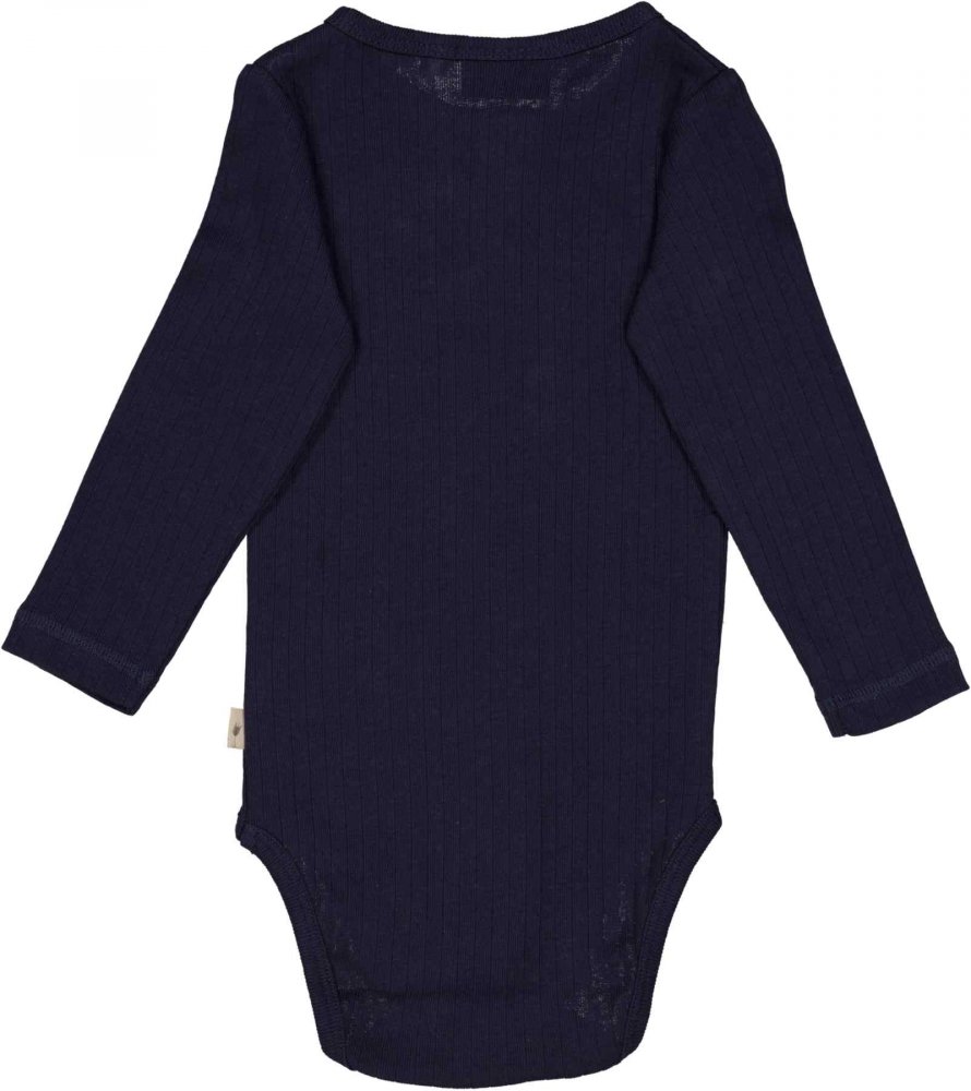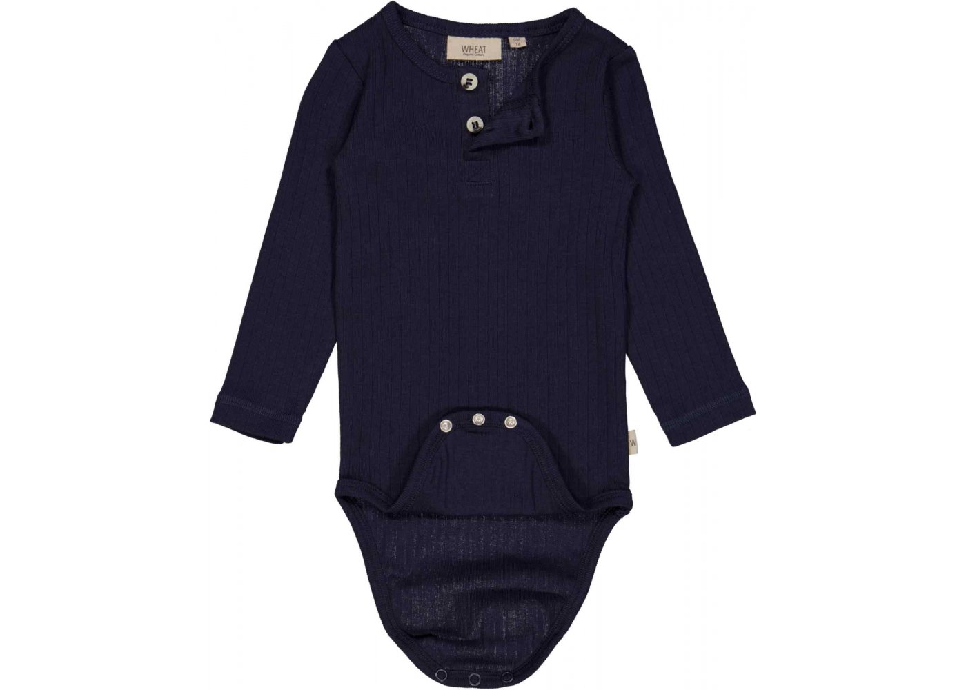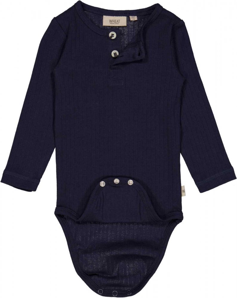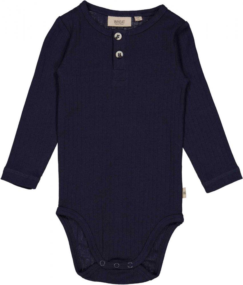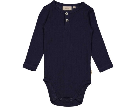 Lækker langærmet rib body i mørkeblå farve fra Wheat.Bodyen har stolpelukning og knapper foran og lukkes med trykknapper imellem ben.