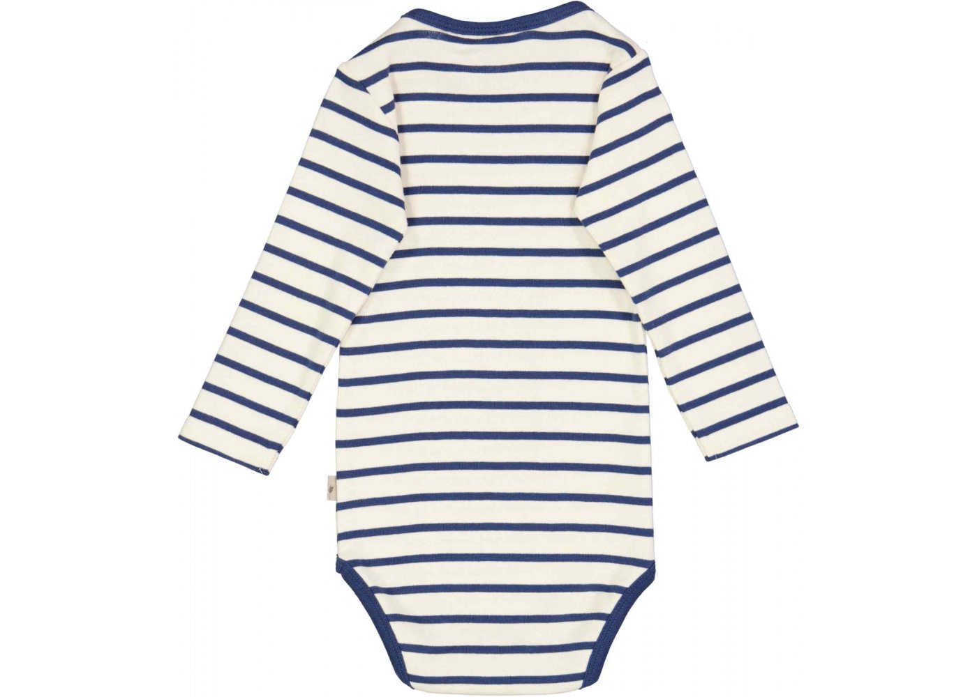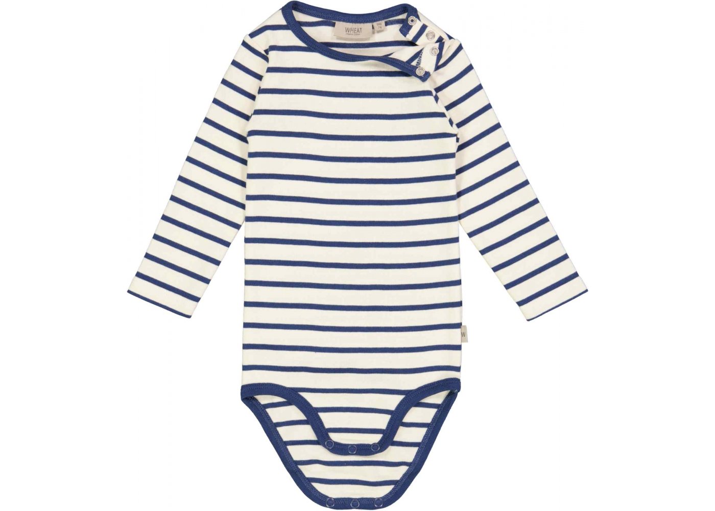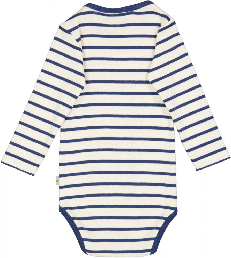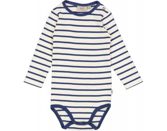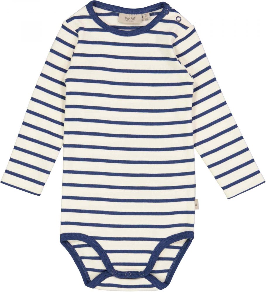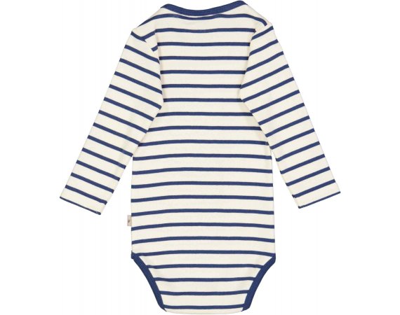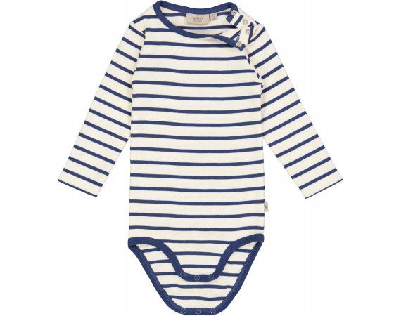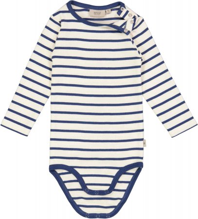 Lækker langærmet stribet body i blå og hvid farve fra Wheat.Bodyen har blå ribkant i halsudskæring og ved ben.