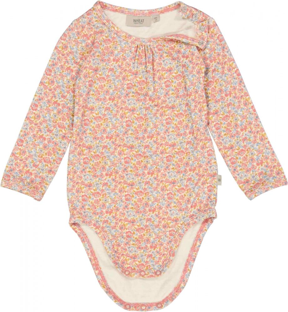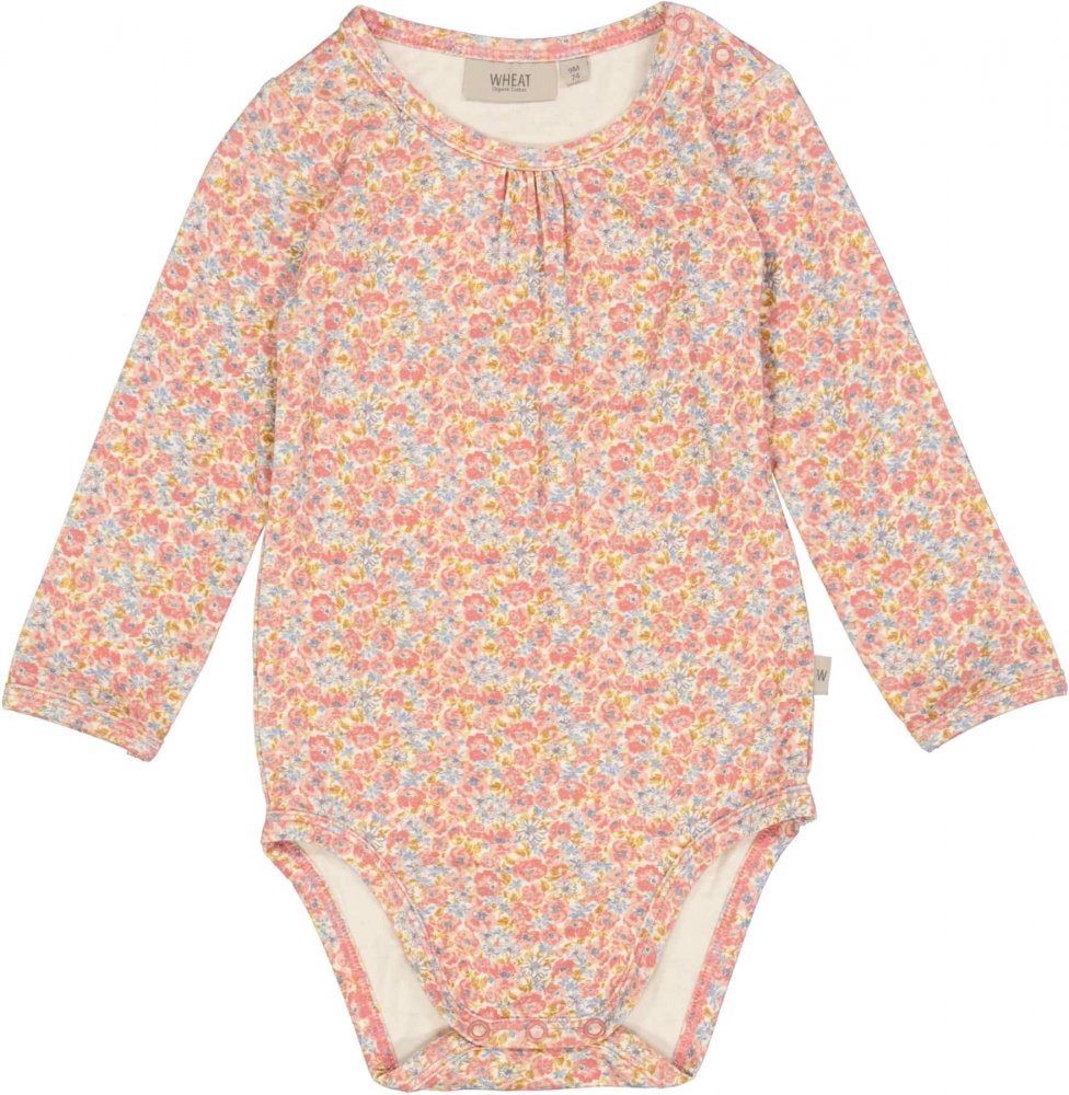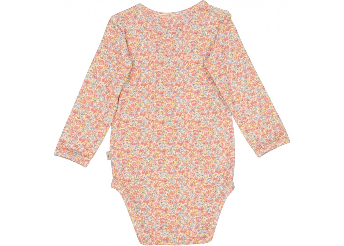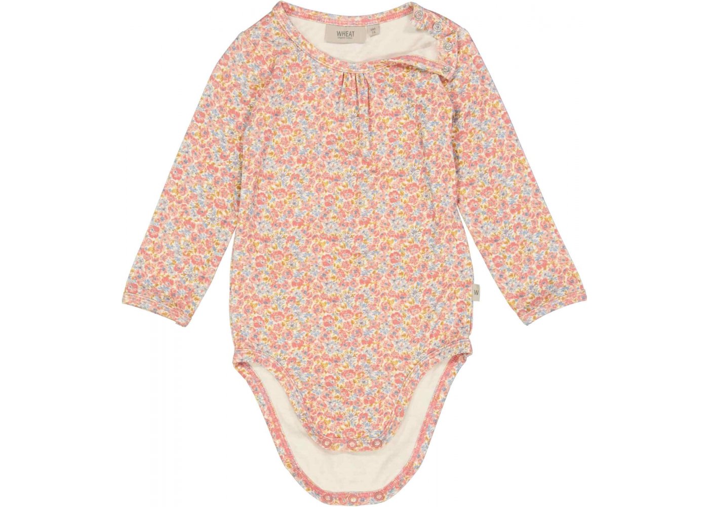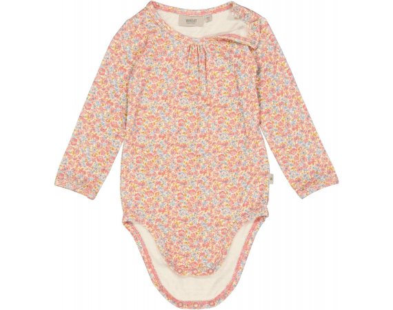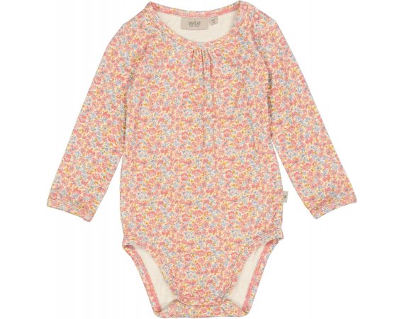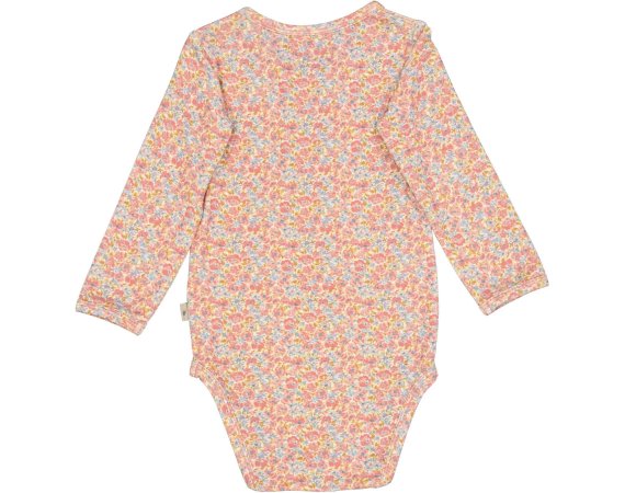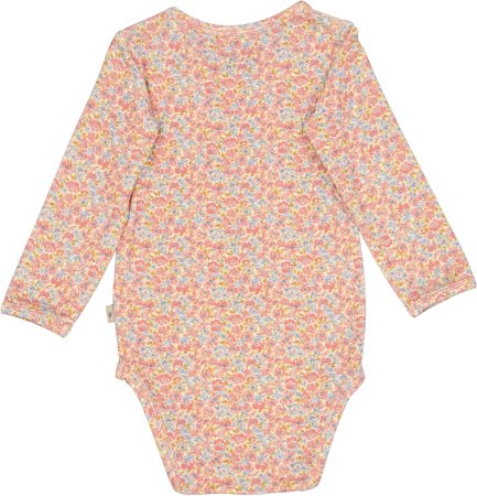 Sød langærmet body med søde håndtegnede blomster i en skøn viskoseblanding.Bodyen har rynk ved halsudskæring og lukkes med trykknapper på venstre skulder og imellem ben.