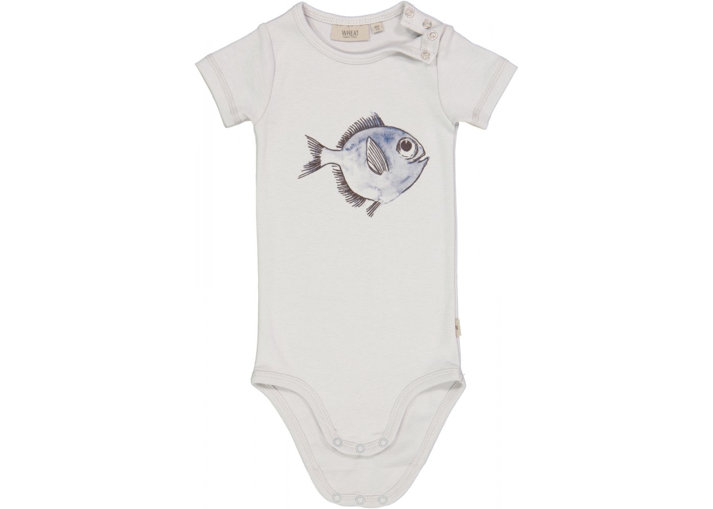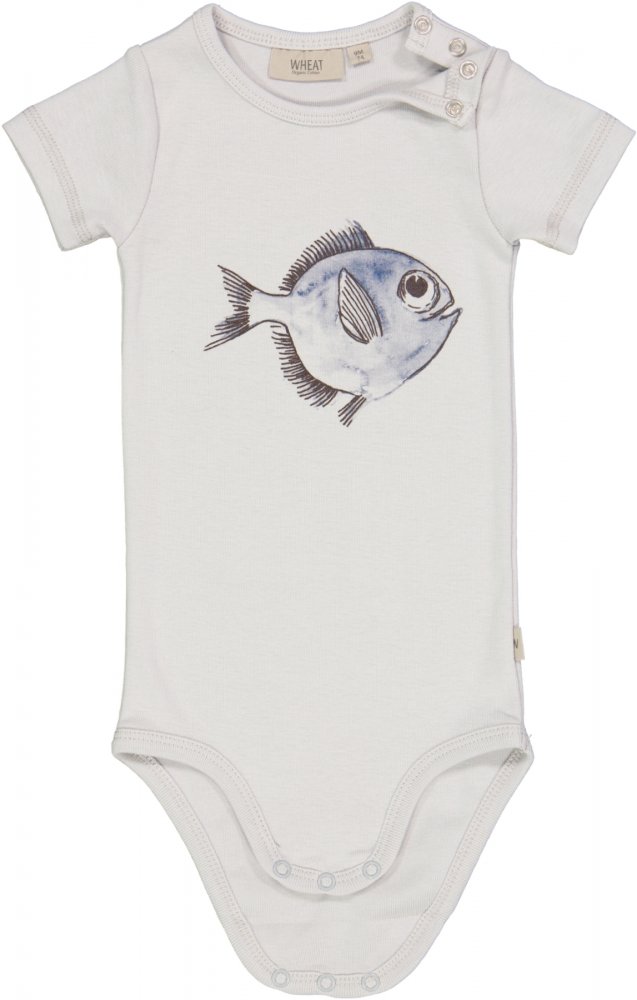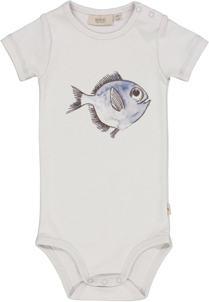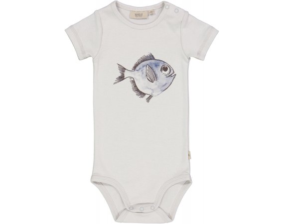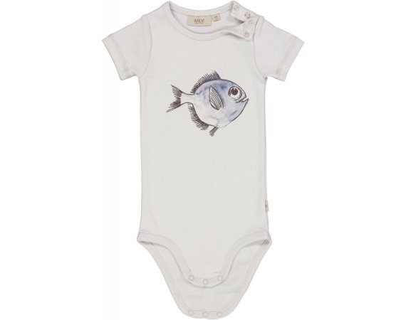 Lækker kortærmet body i blå farve med et sjovt fiskemotiv fra Wheat.Bodyen lukkes med trykknapper på venstre skulder og imellem ben og er fremstillet i en lækker, blød økologisk bomuld.