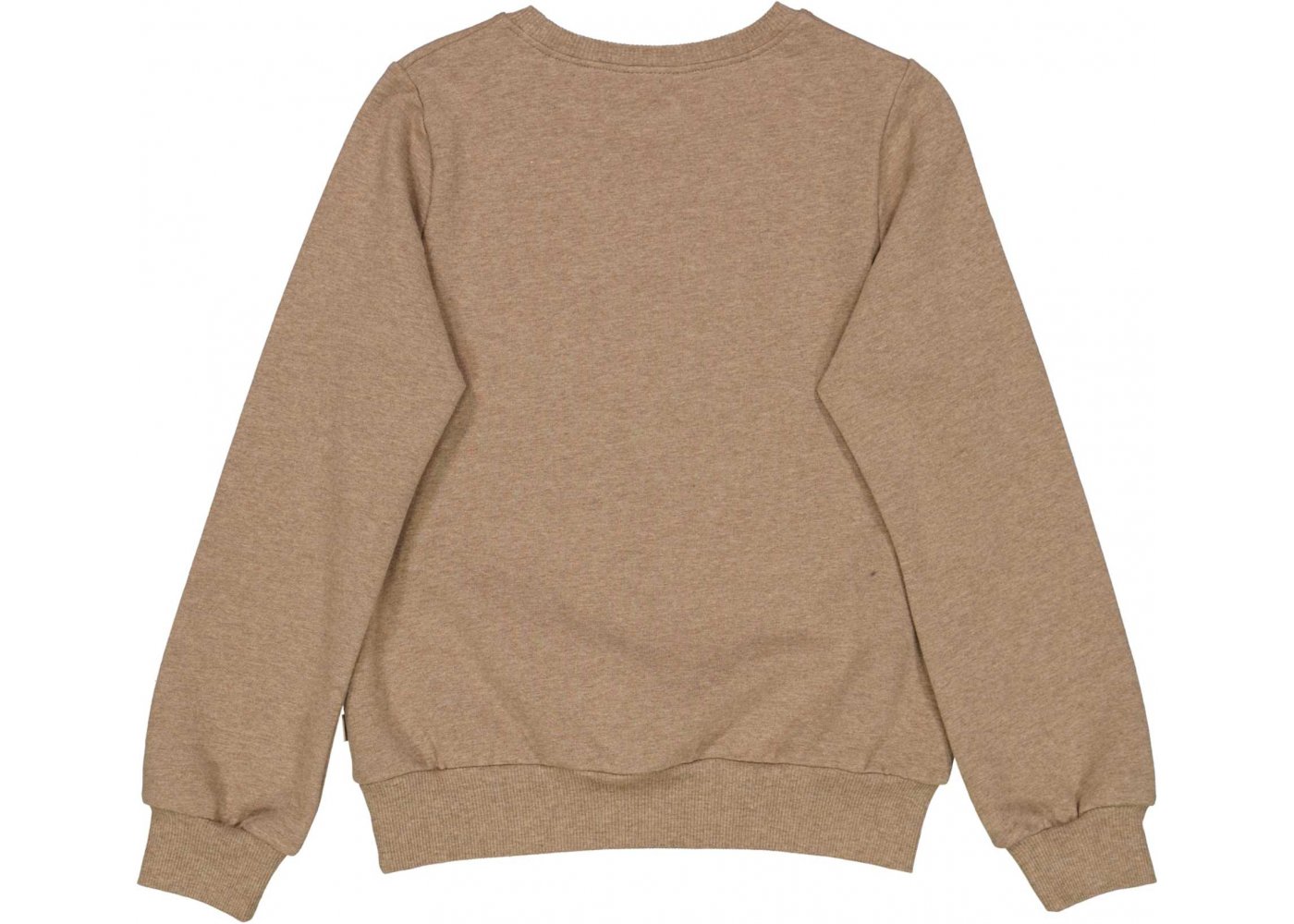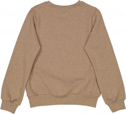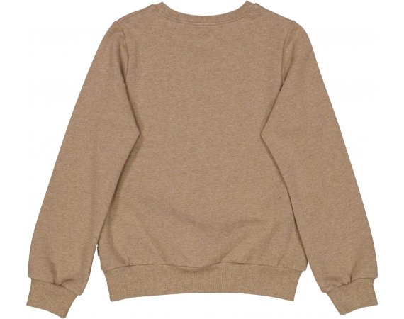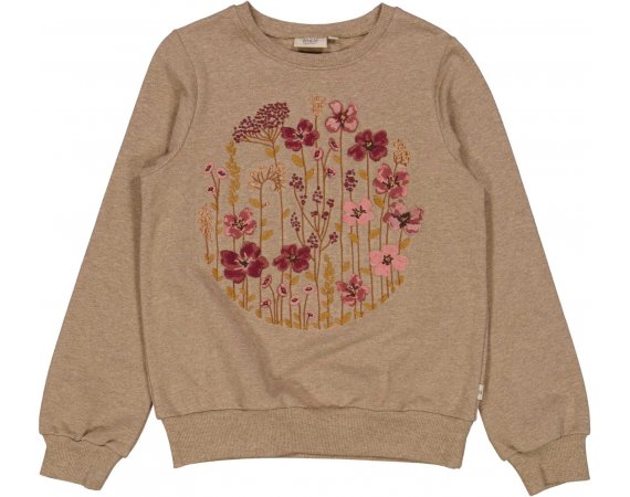 Sweatshirten er i flot beige brun jordfarve, og er pyntet foran med et rundt blomster broderi i rosa og gule nuancer. Sweatshirten har rund hals og ribkanter i alle åbninger.