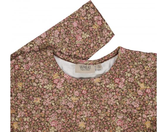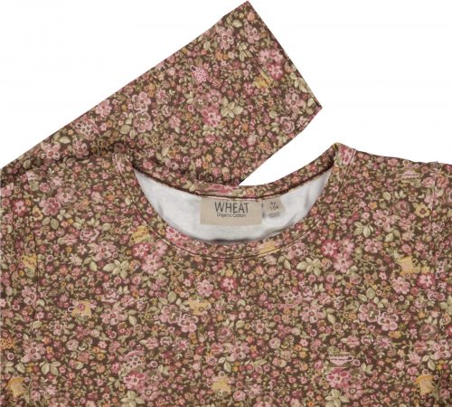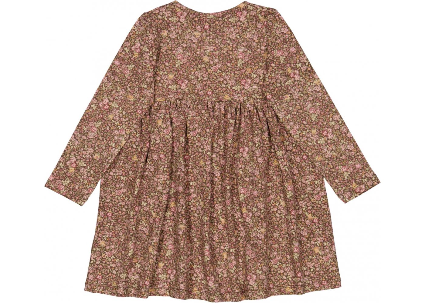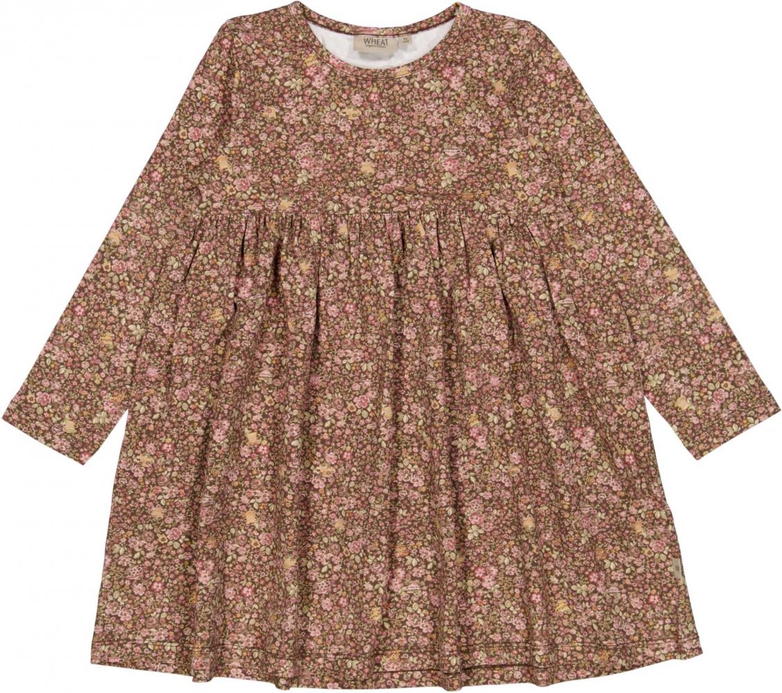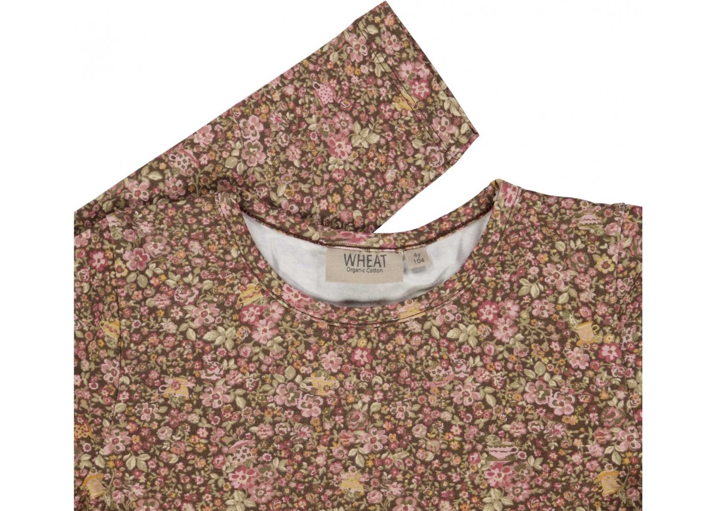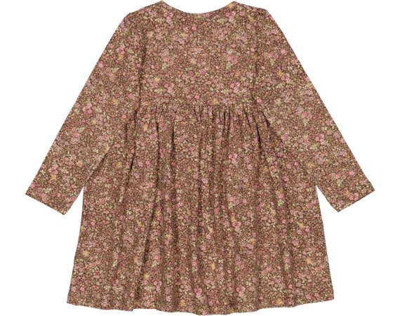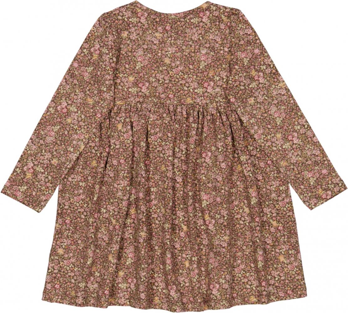 Yndig kjole med flot håndtegnet blomsterprint, tekopper og mus i rosa, gule og grønne nuancer.
