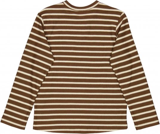 Sweatshirten er i brun- og off white, har rund hals og fin knaphulslukning på venstre skulder.