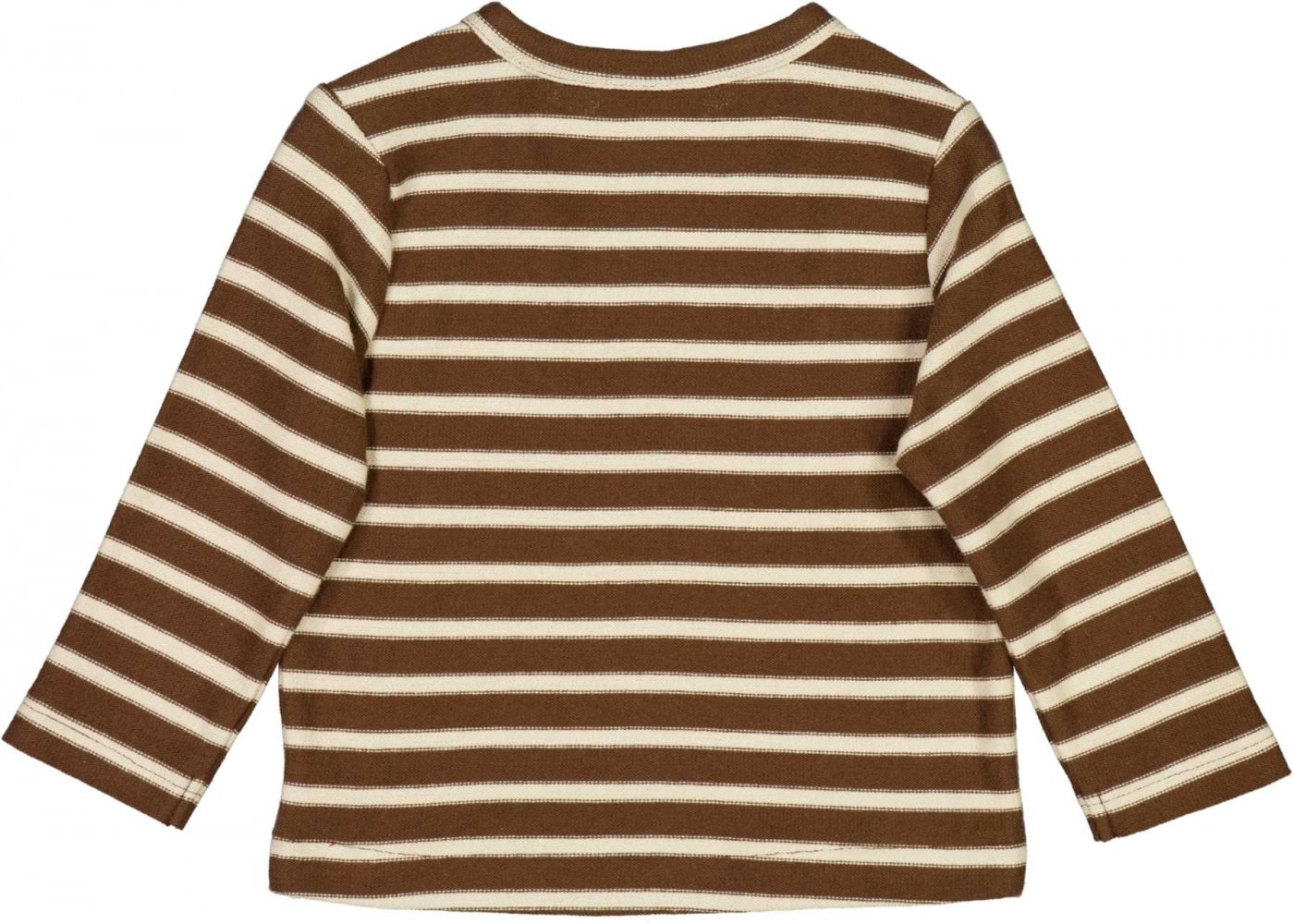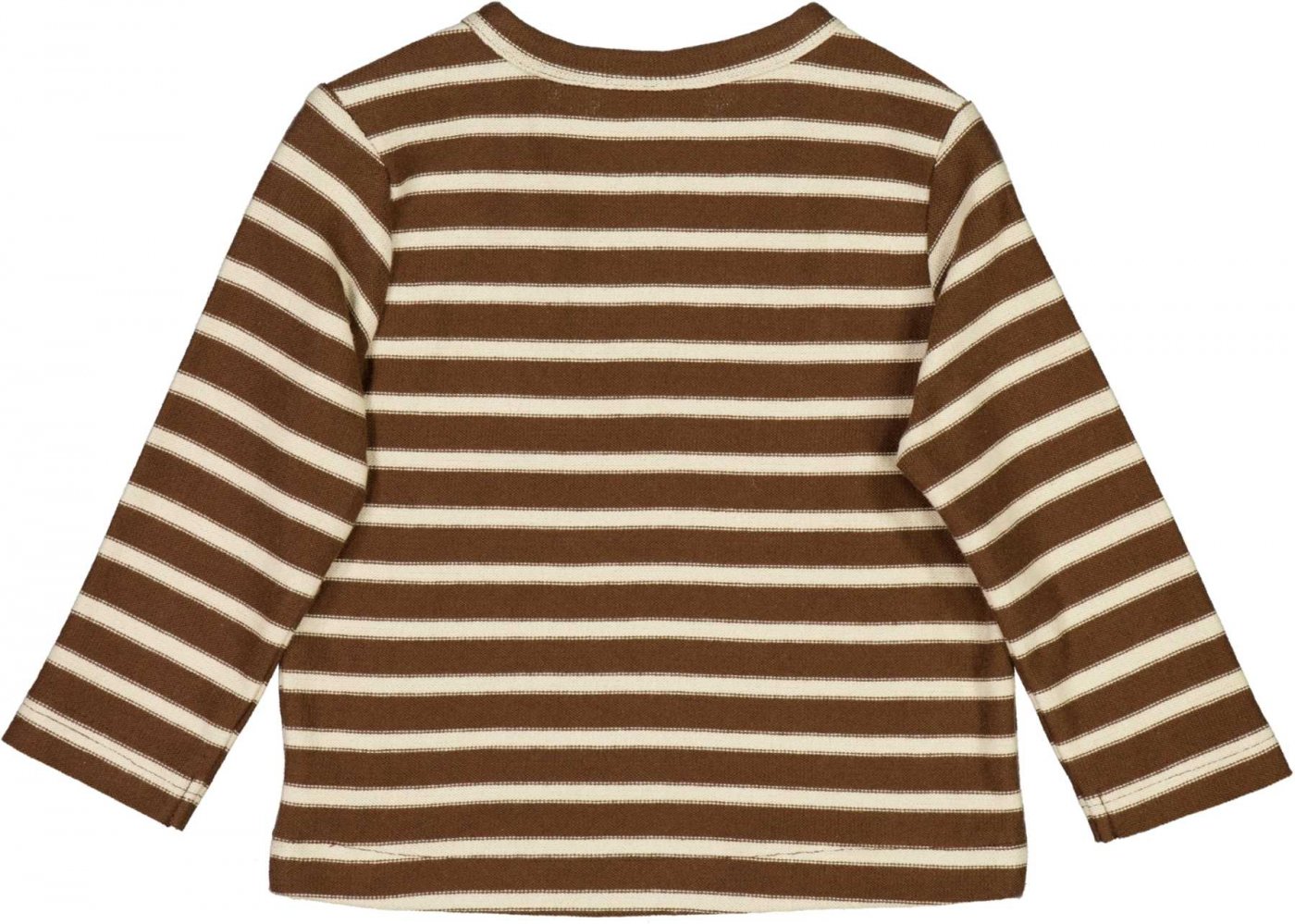 Sweatshirten er i brun- og off white, har rund hals og fin knaphulslukning på venstre skulder.