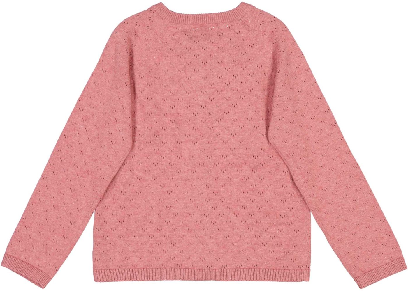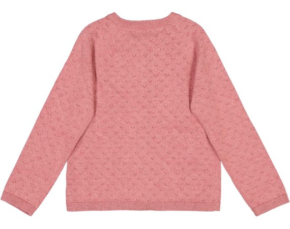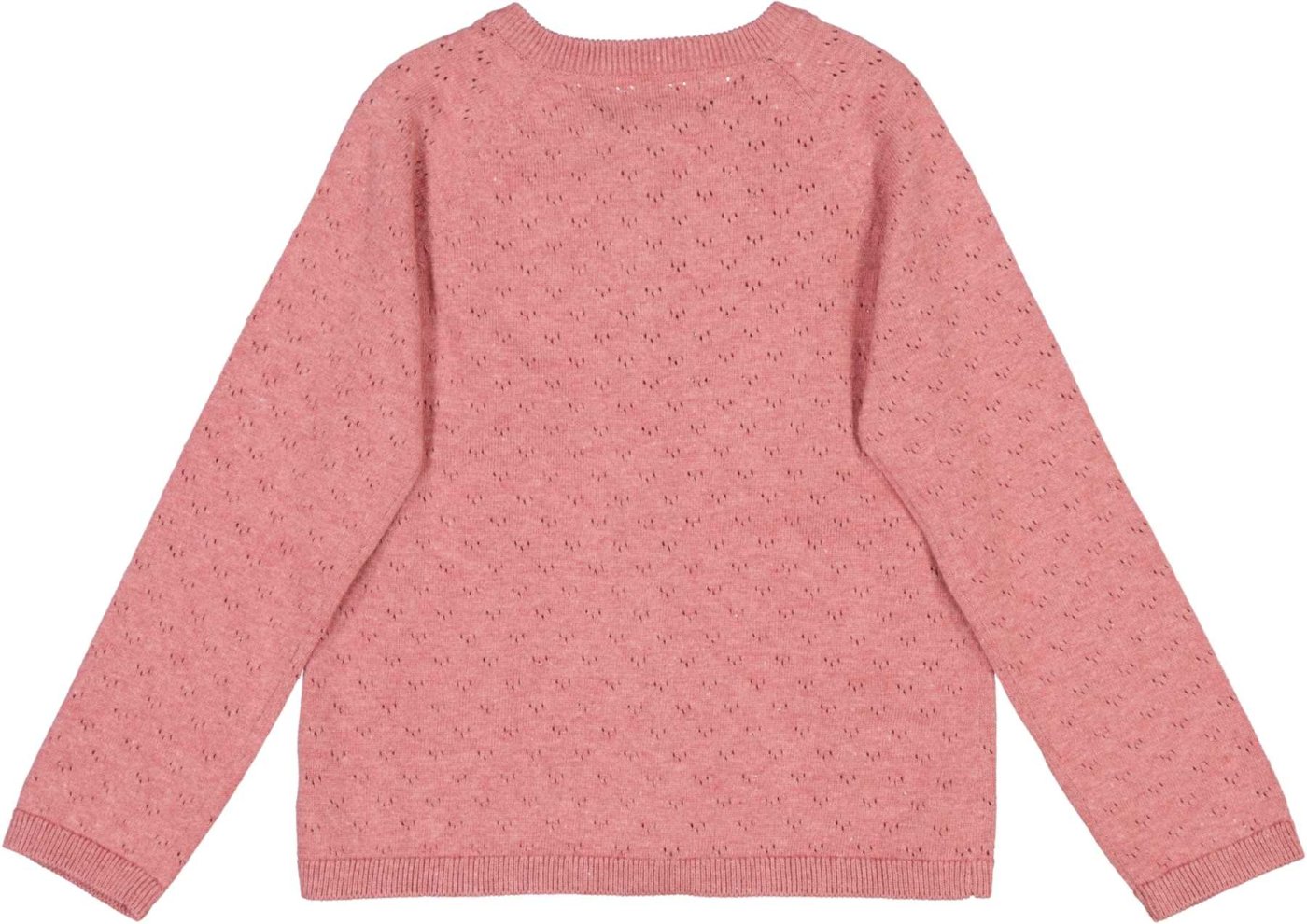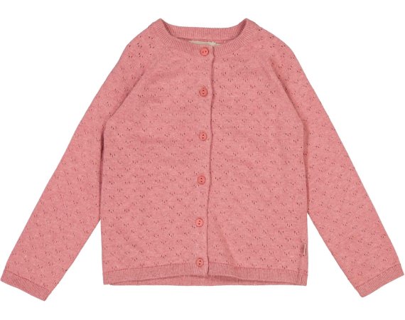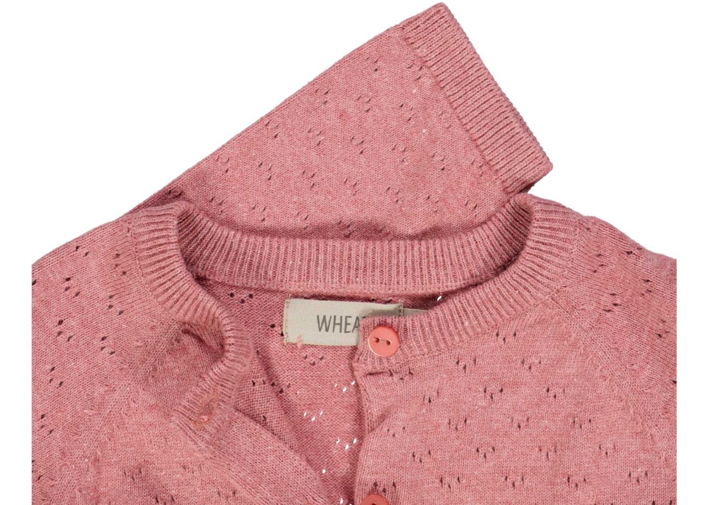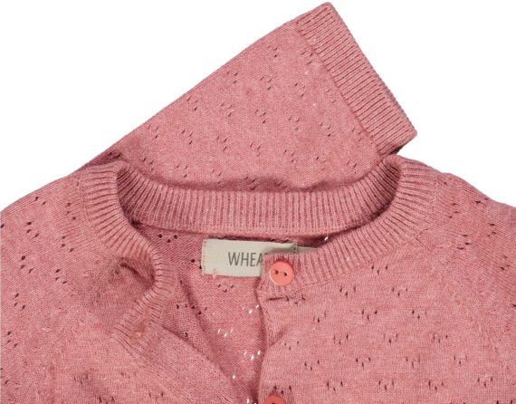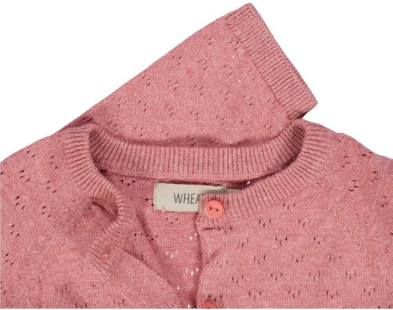 Smart langærmet lyserød cardigan i klassisk pointelle-strikmønster fra Wheat.