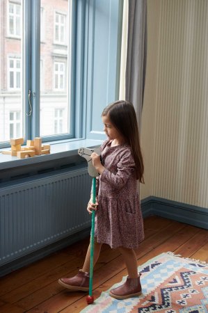 Kjolen har rund hals og store påsyede lommer. Den sidder løst henover brystet og har et rynket skørt, der giver fin vidde. En super skøn og behagelig kjole der giver god bevægelighed.