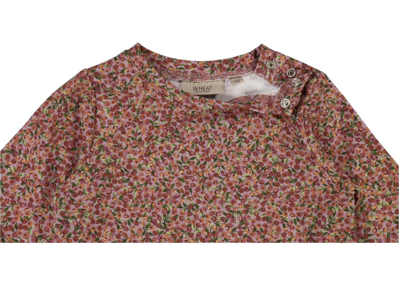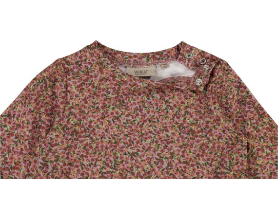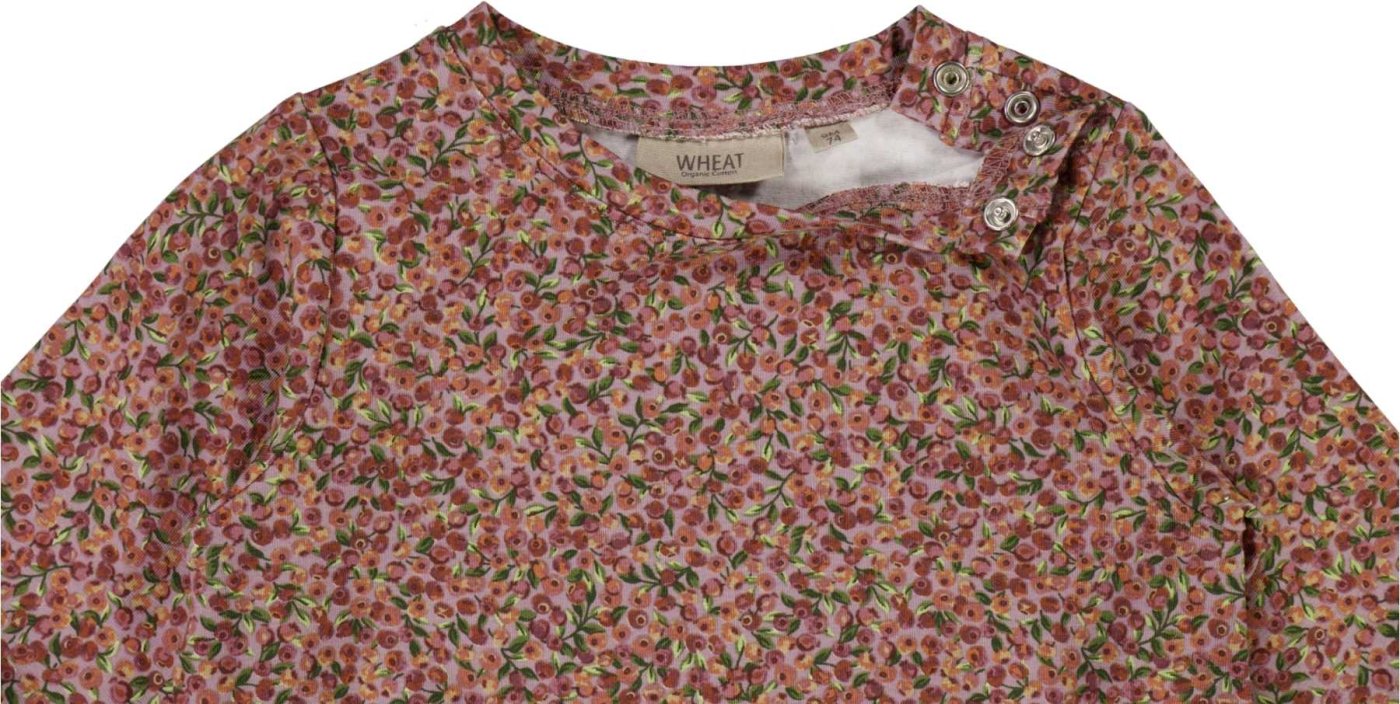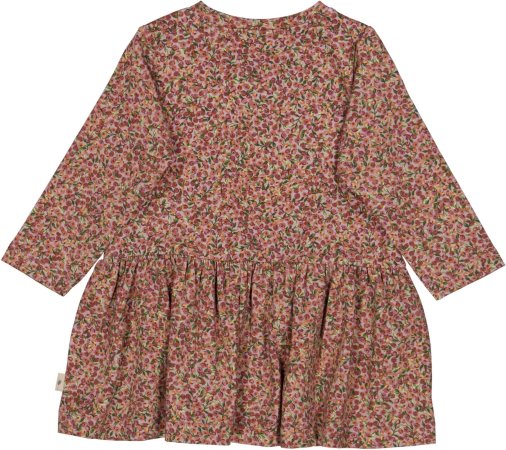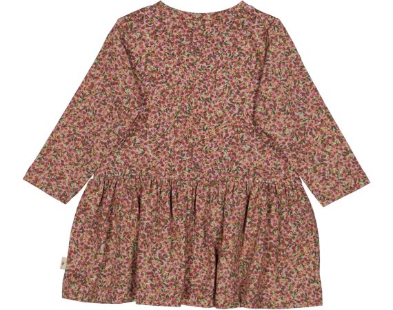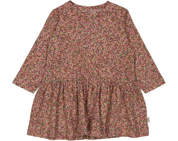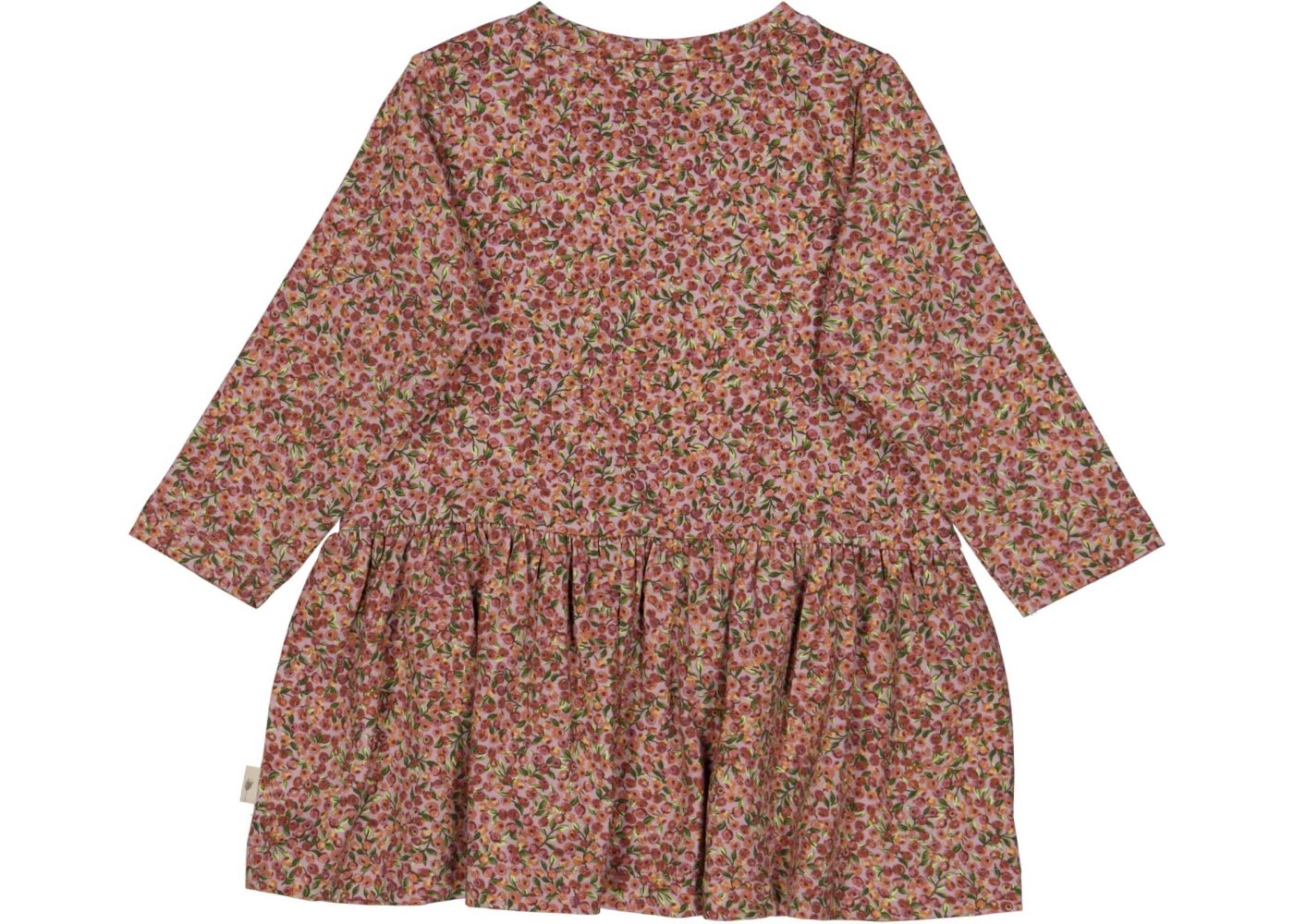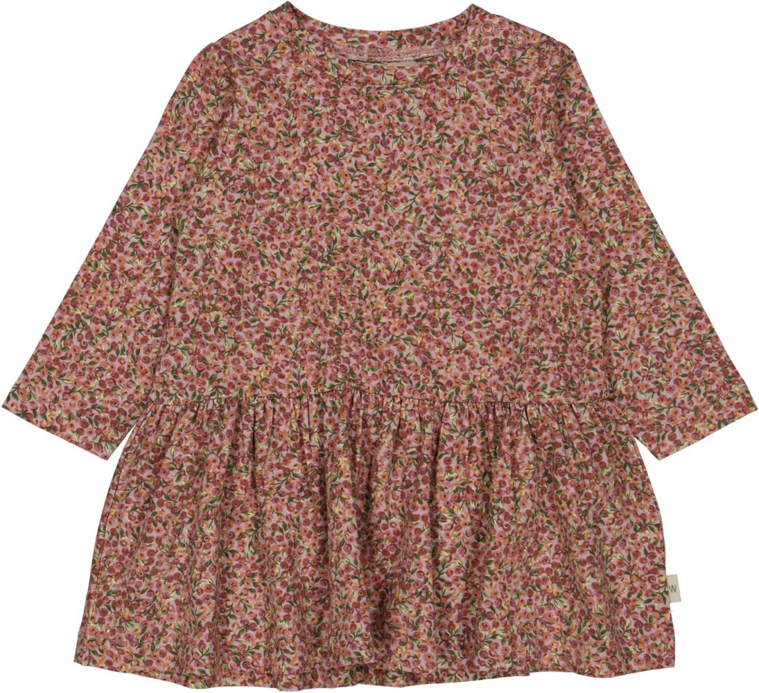 Langærmet jersey kjole fyldt med håndtegnede, smukke bær i rosa og grønne nuancer fra Wheat.