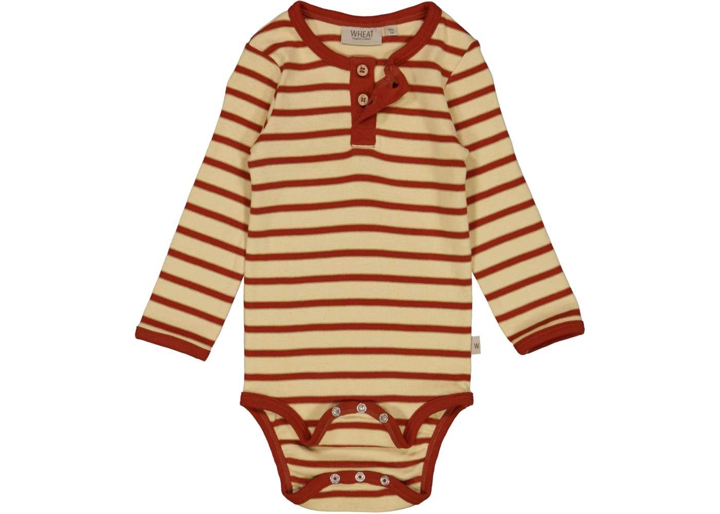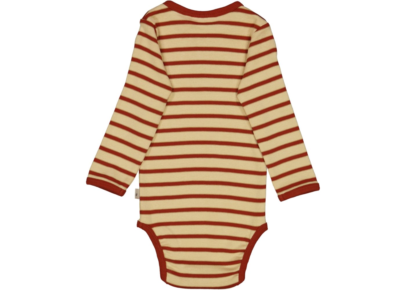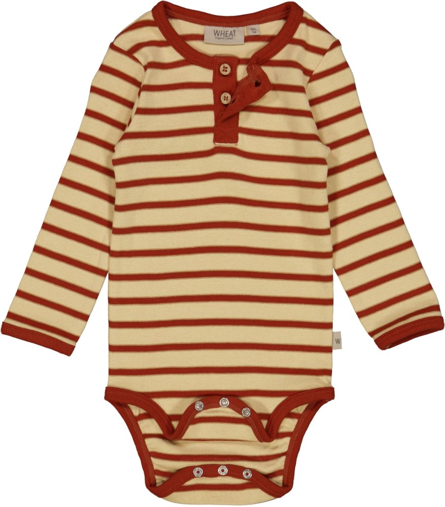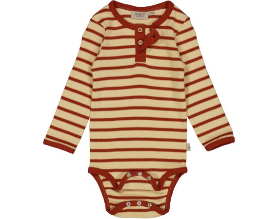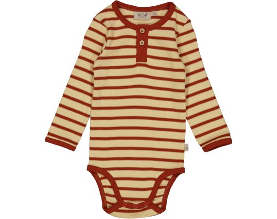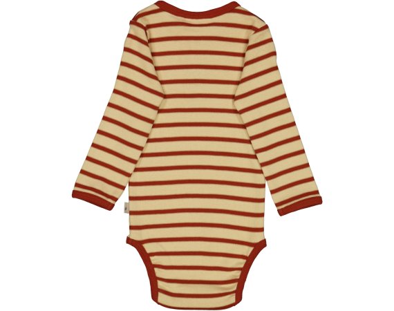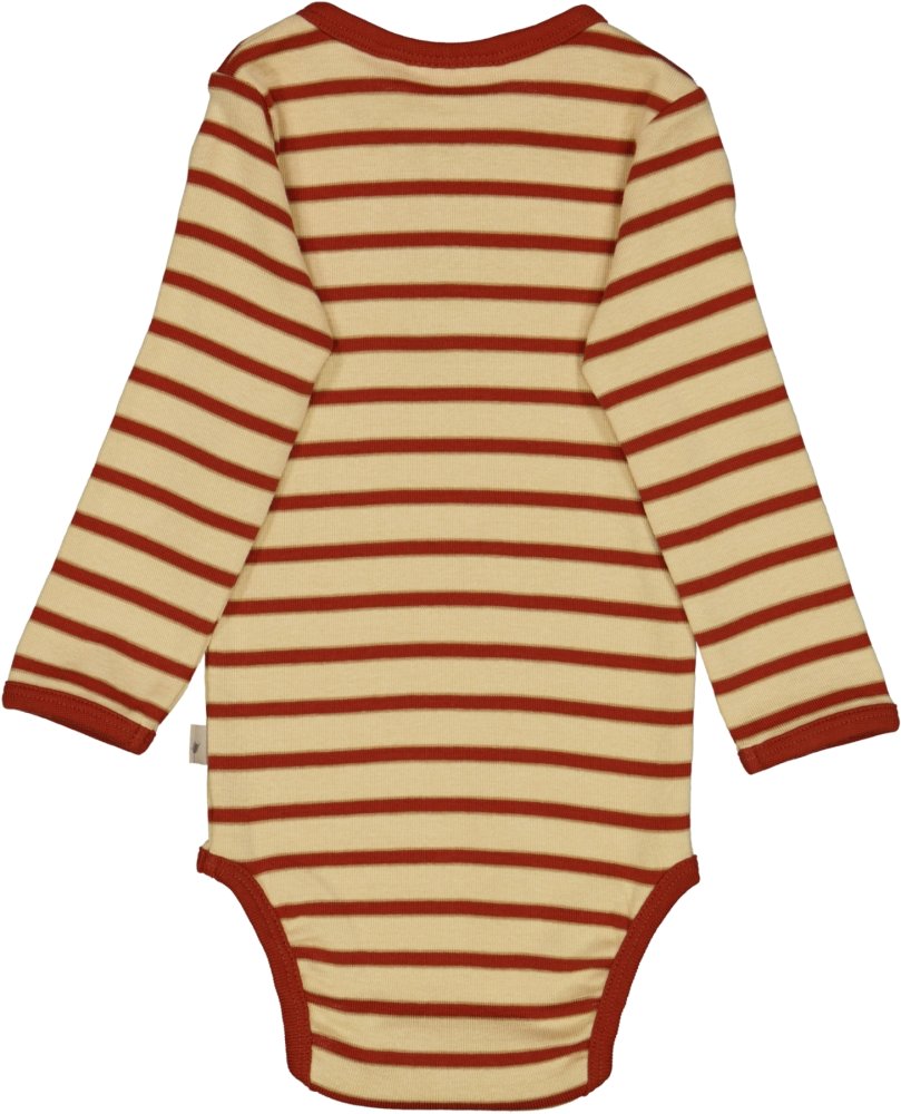 Smart langærmet body med striber og rustrødt kantebånd i alle åbninger fra Wheat.