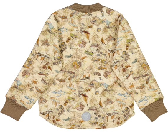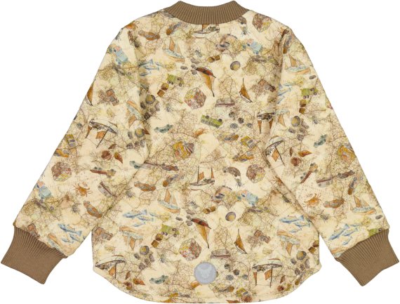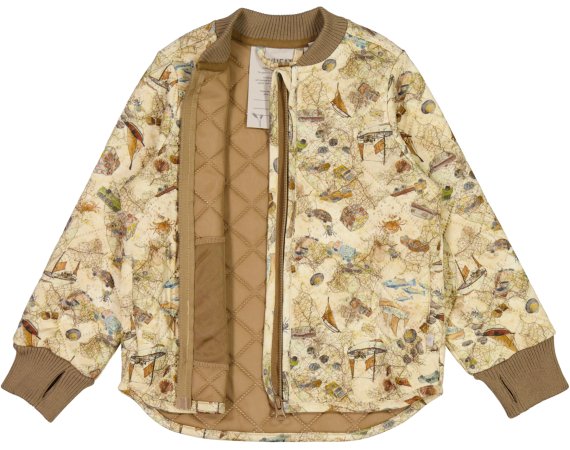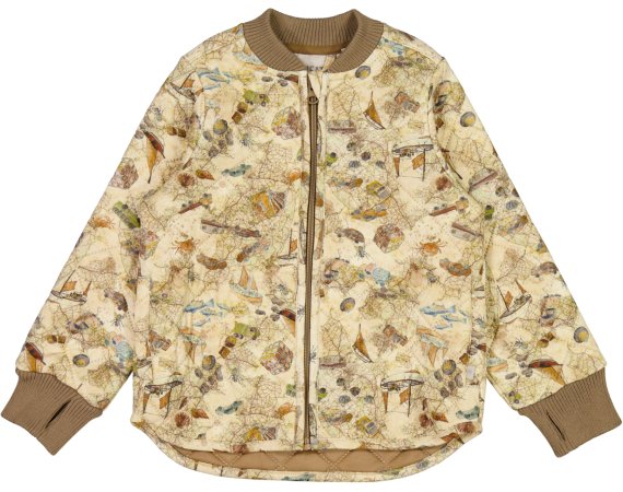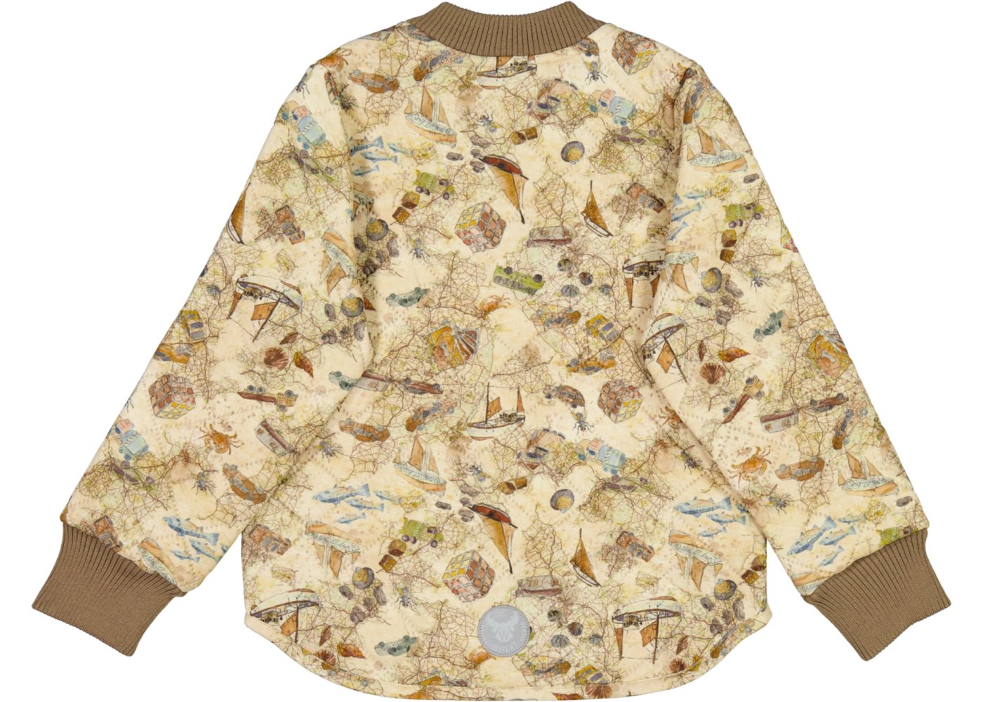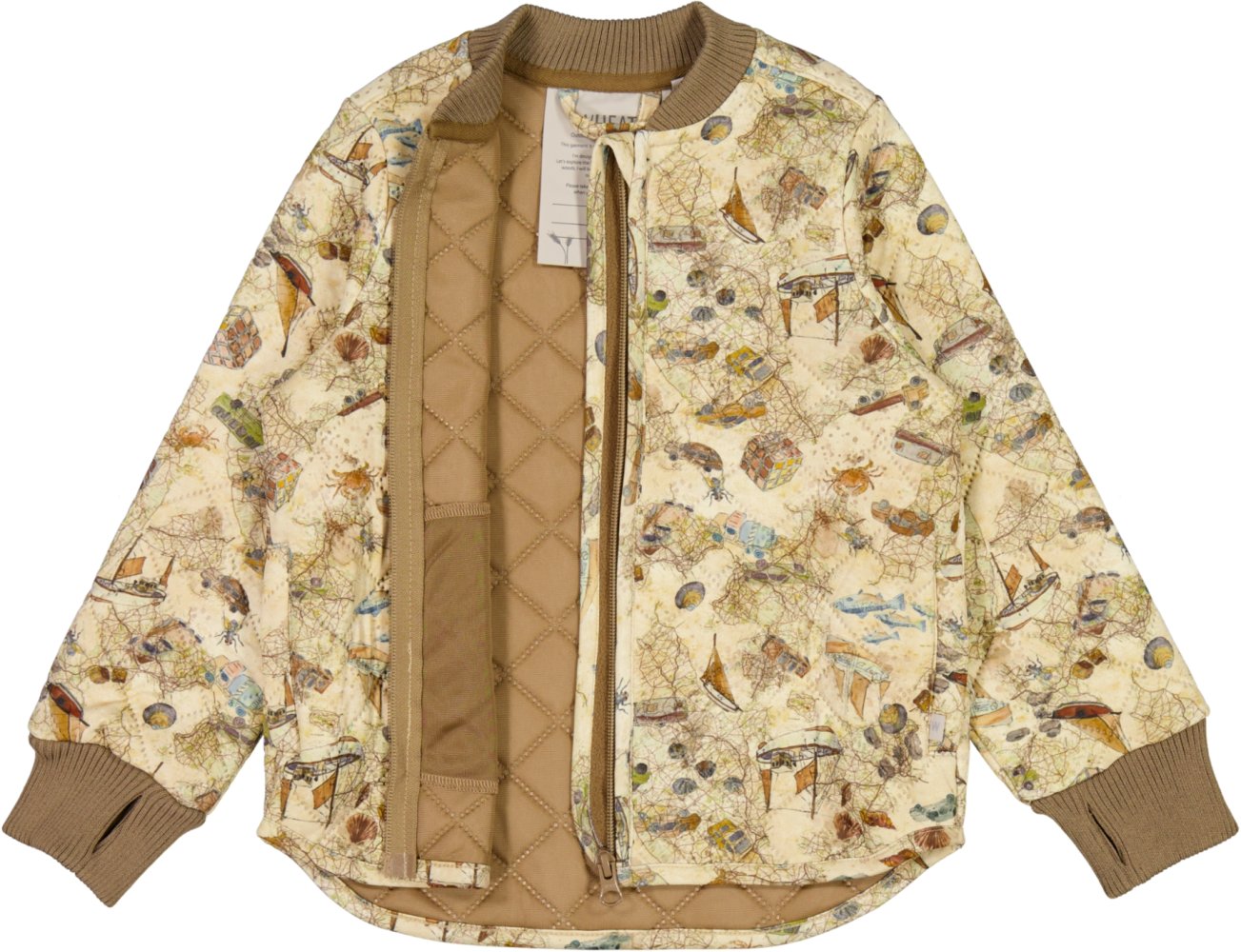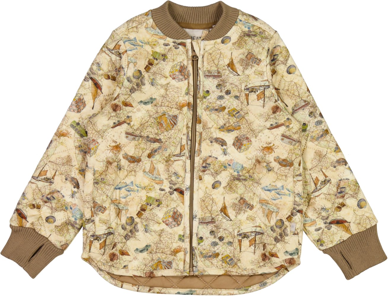 Quiltet lys Wheat termojakke fyldt med skibe, fisk, krabber, terninger og mange andre sjove print i flere støvede nuancer. Jakken har en smart buet form forneden.
