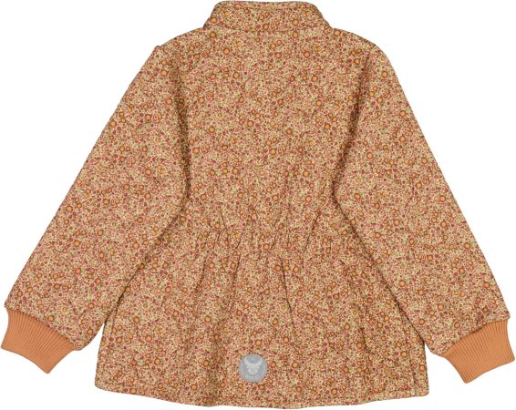 Quiltet A-formet Wheat jakke med bærestykke og blomster print i skøn rød, gul, grøn og orange. Jakken har kantebånd og elastik bagpå, der giver jakken et smart look. Den har krave og manchetter i ensfarvet orange rib og et cool hul til tommelfinger.