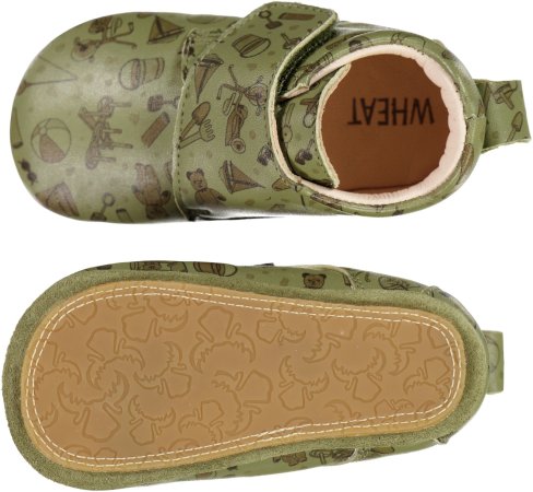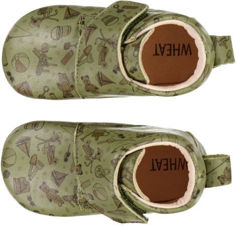 Lækre hjemmesko i skind med flotte håndtegnede haveredskaber og velcrolukning fra Wheat.