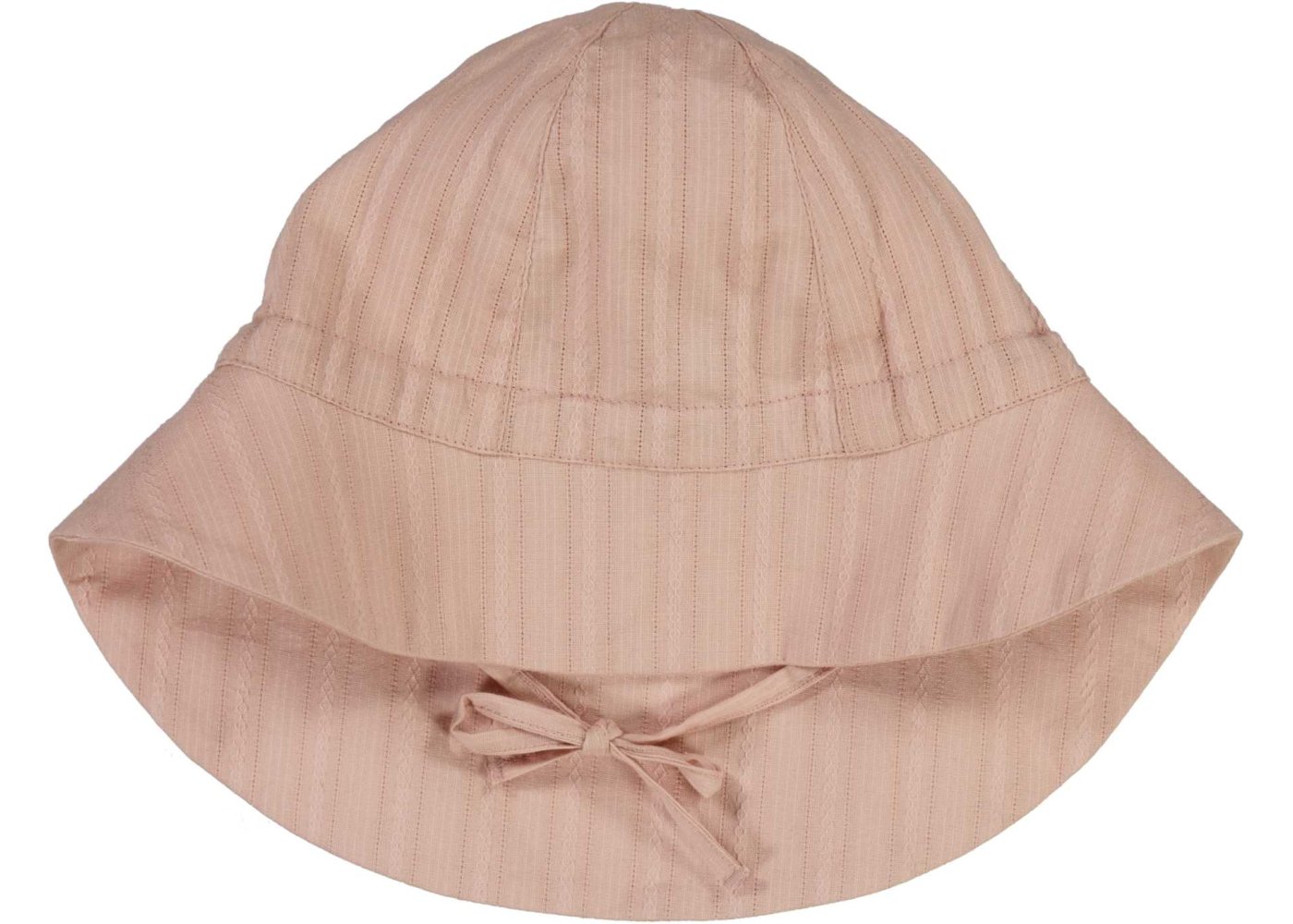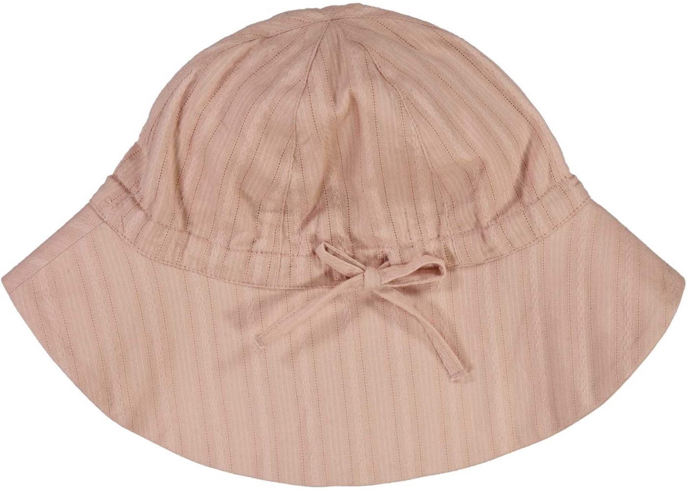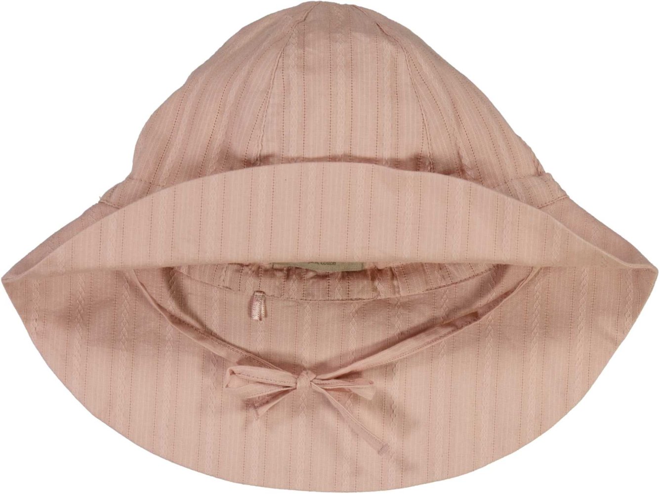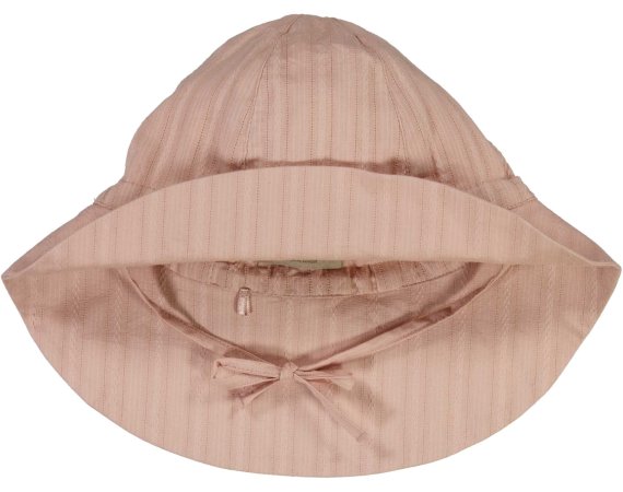 Solhatten er lidt længere bagtil. Den har bindebånd og kan snøres ind omkring hovedet med en sløjfe bagtil. Den er lavet i en lækker blød bomuldskvalitet.