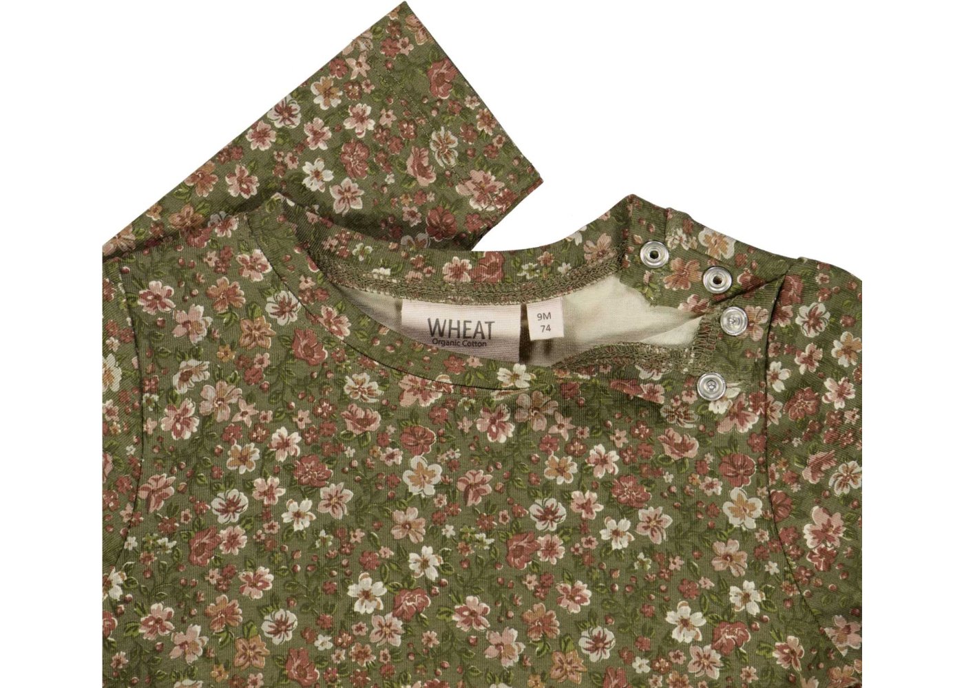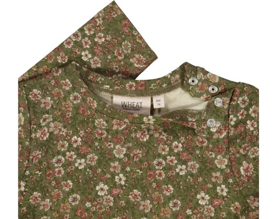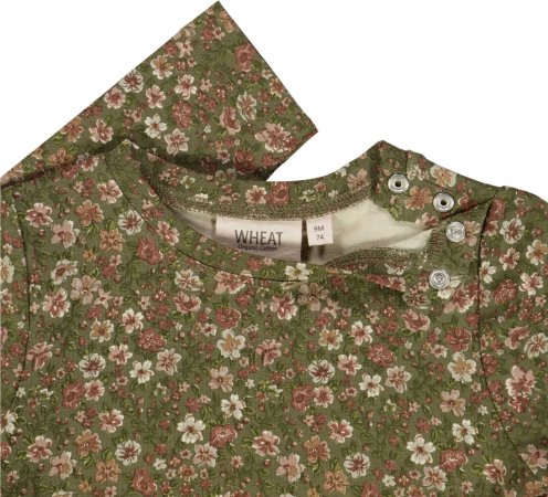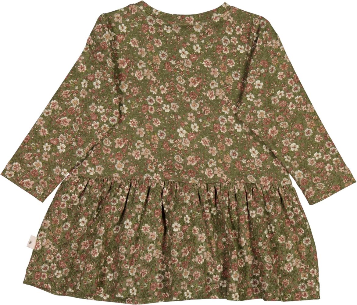 Langærmet grøn jersey kjole fyldt med flot håndtegnet blomsterprint i hvide og rosa nuancer.