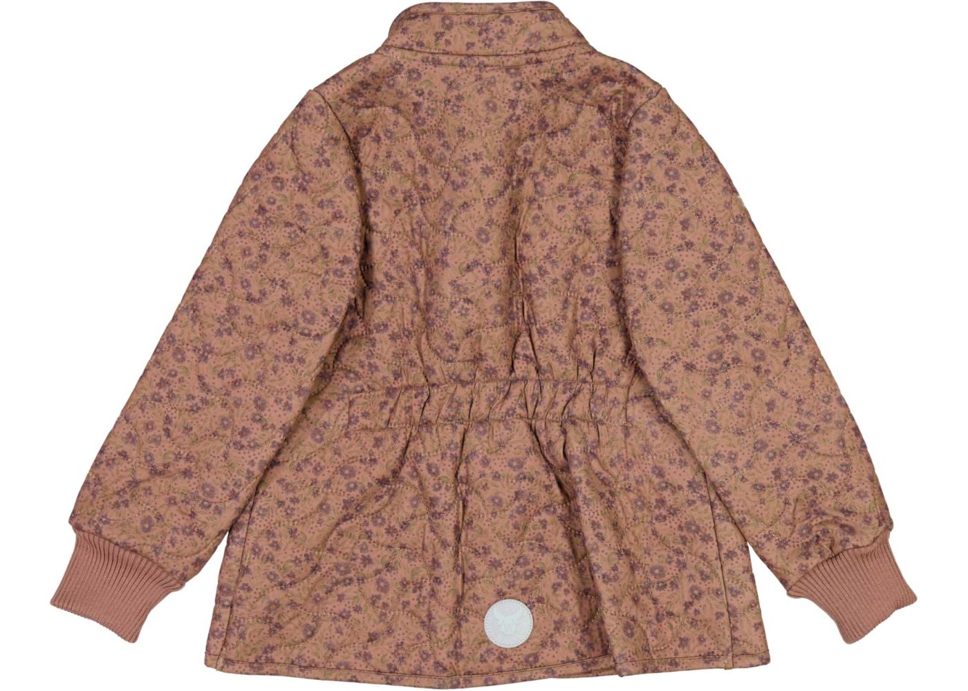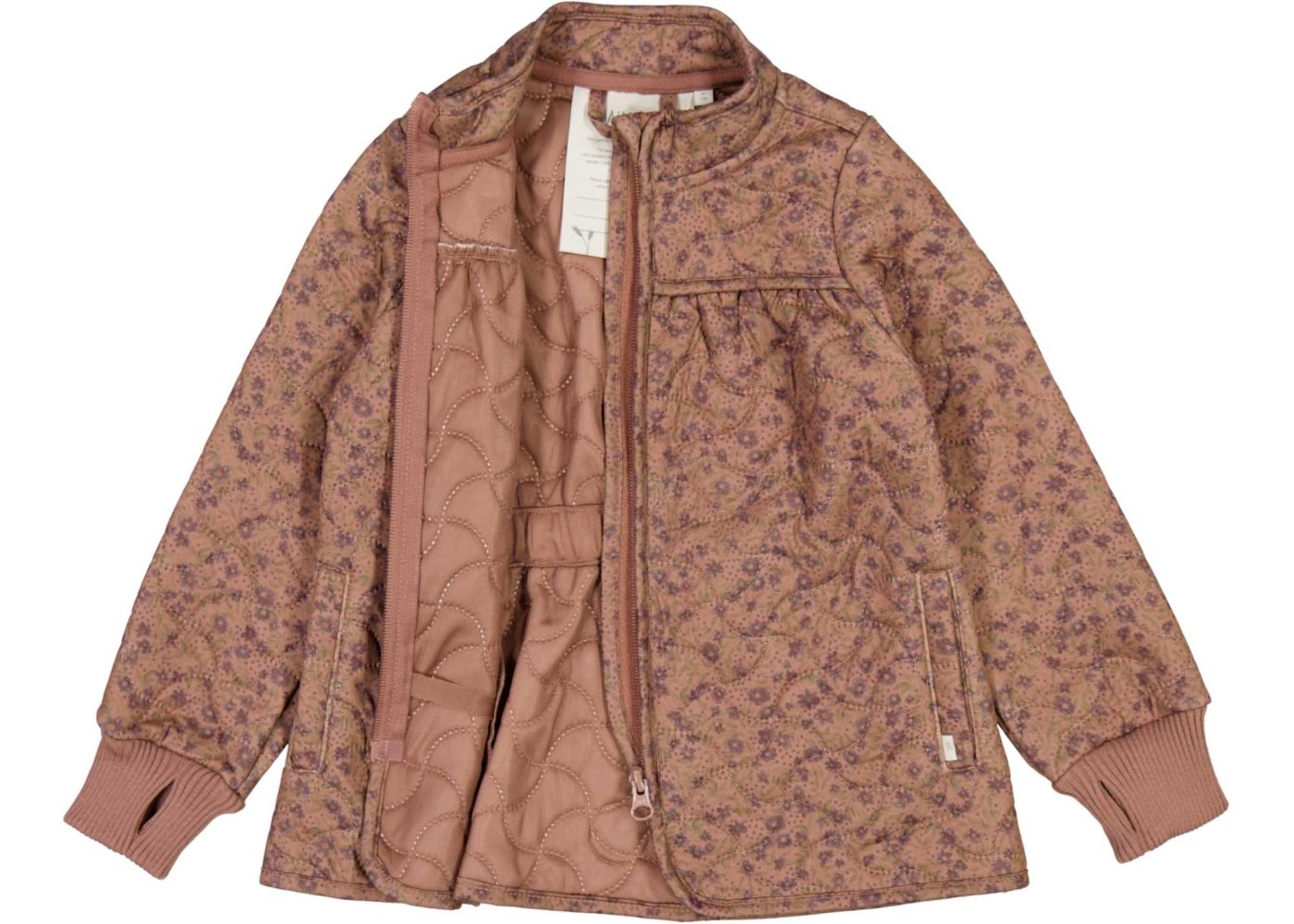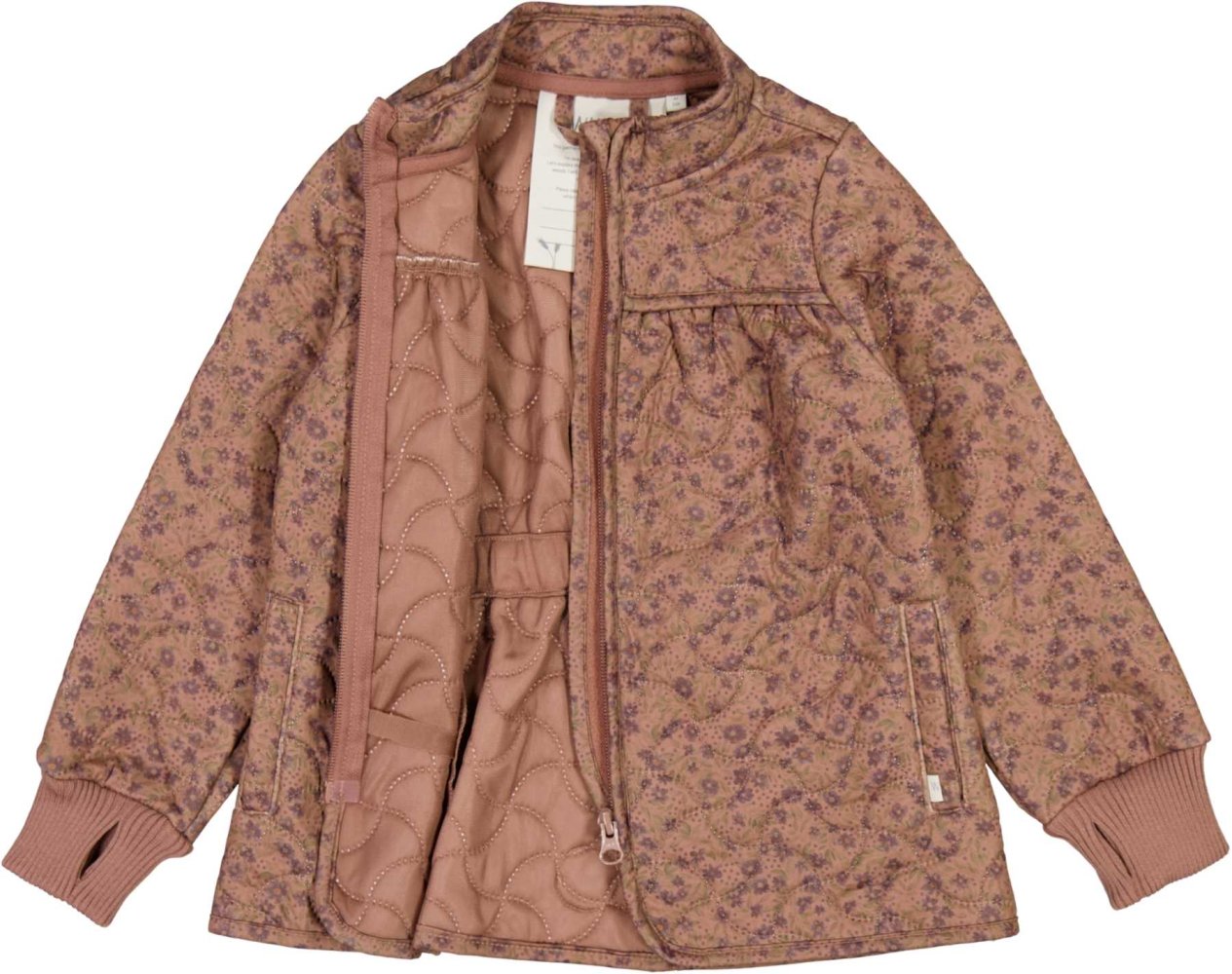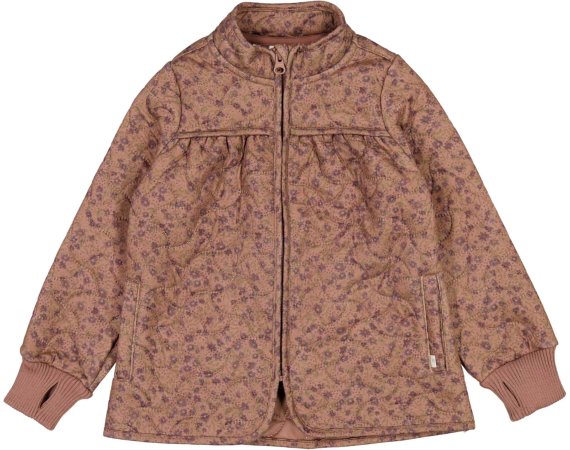 Quiltet A-formet Wheat jakke med bærestykke og blomster print i skøn lilla, grøn og rosa. Jakken har kantebånd og elastik bagpå, der giver jakken et smart look. Den har krave og manchetter i rib og som en cool detalje, er der hul til tommelfinger i ribkanten.
