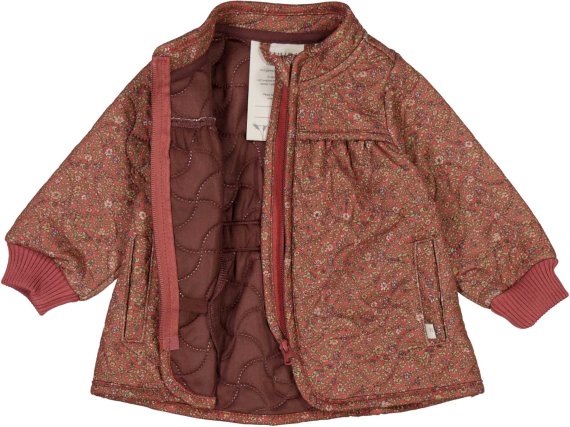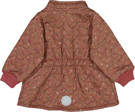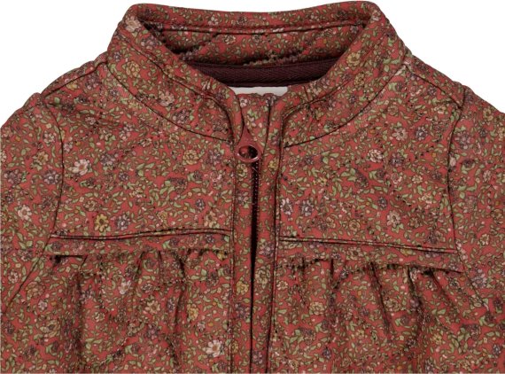 Quiltet A-formet Wheat jakke med bærestykke og blomster print i skøn rød, gul, grøn og rosa. Jakken har kantebånd og elastik bagpå, der giver jakken et smart look. Den har krave og manchetter i rib og som en cool detalje, er der hul til tommelfinger i ribkanten.