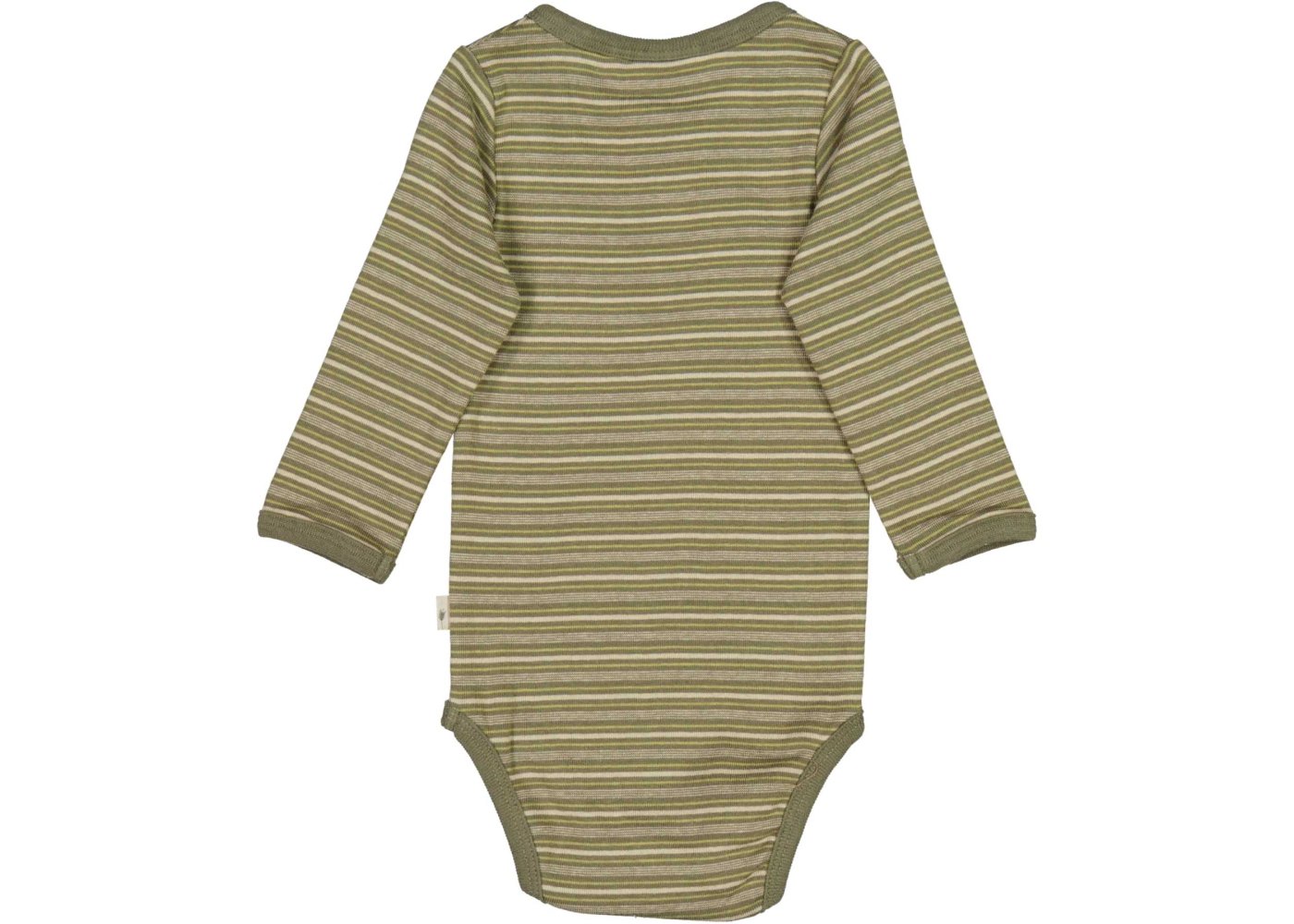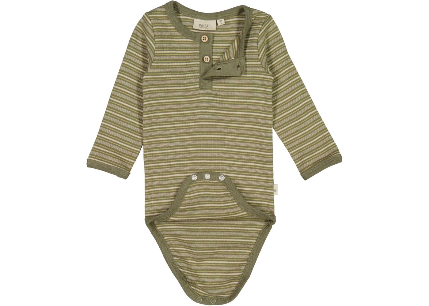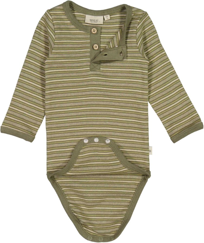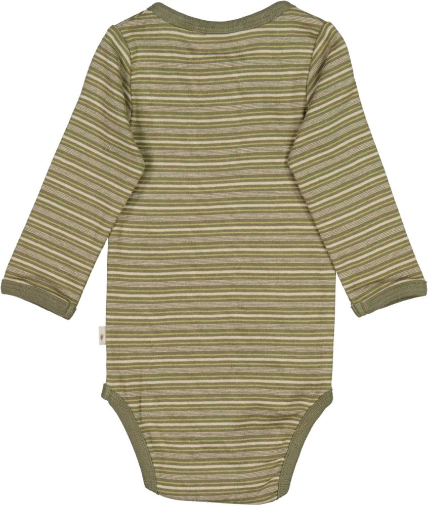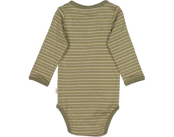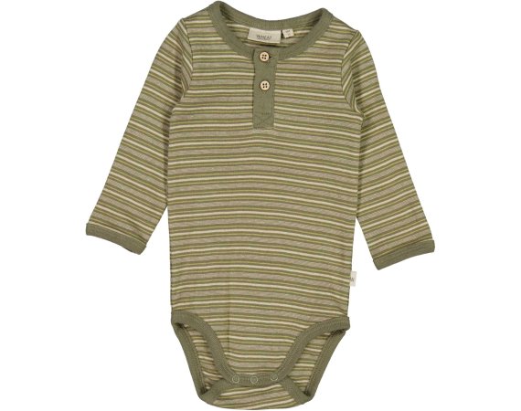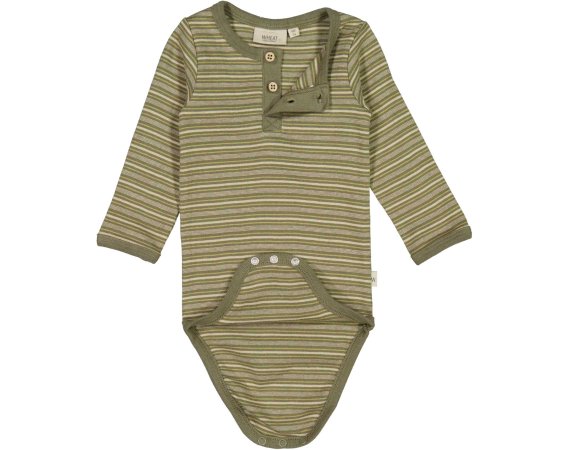 Bodyen har lange ærmer og ribkanter i alle åbninger. Den har stolpelukning foran og trykknapper mellem ben. Bodyen er fremstillet i økologisk bomuld.