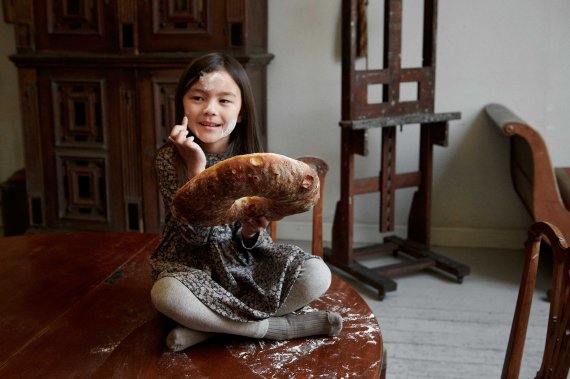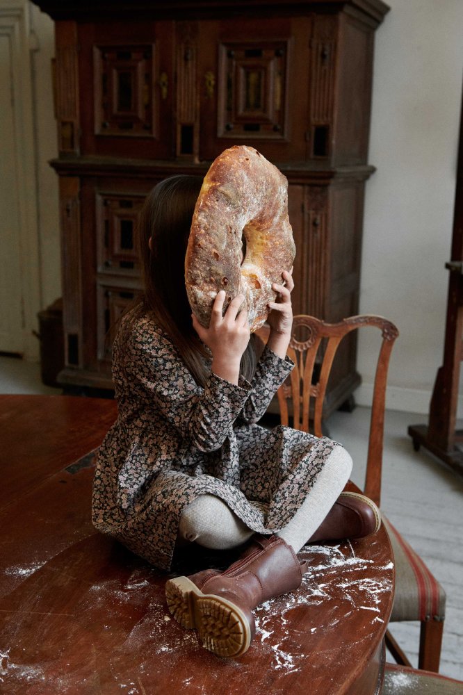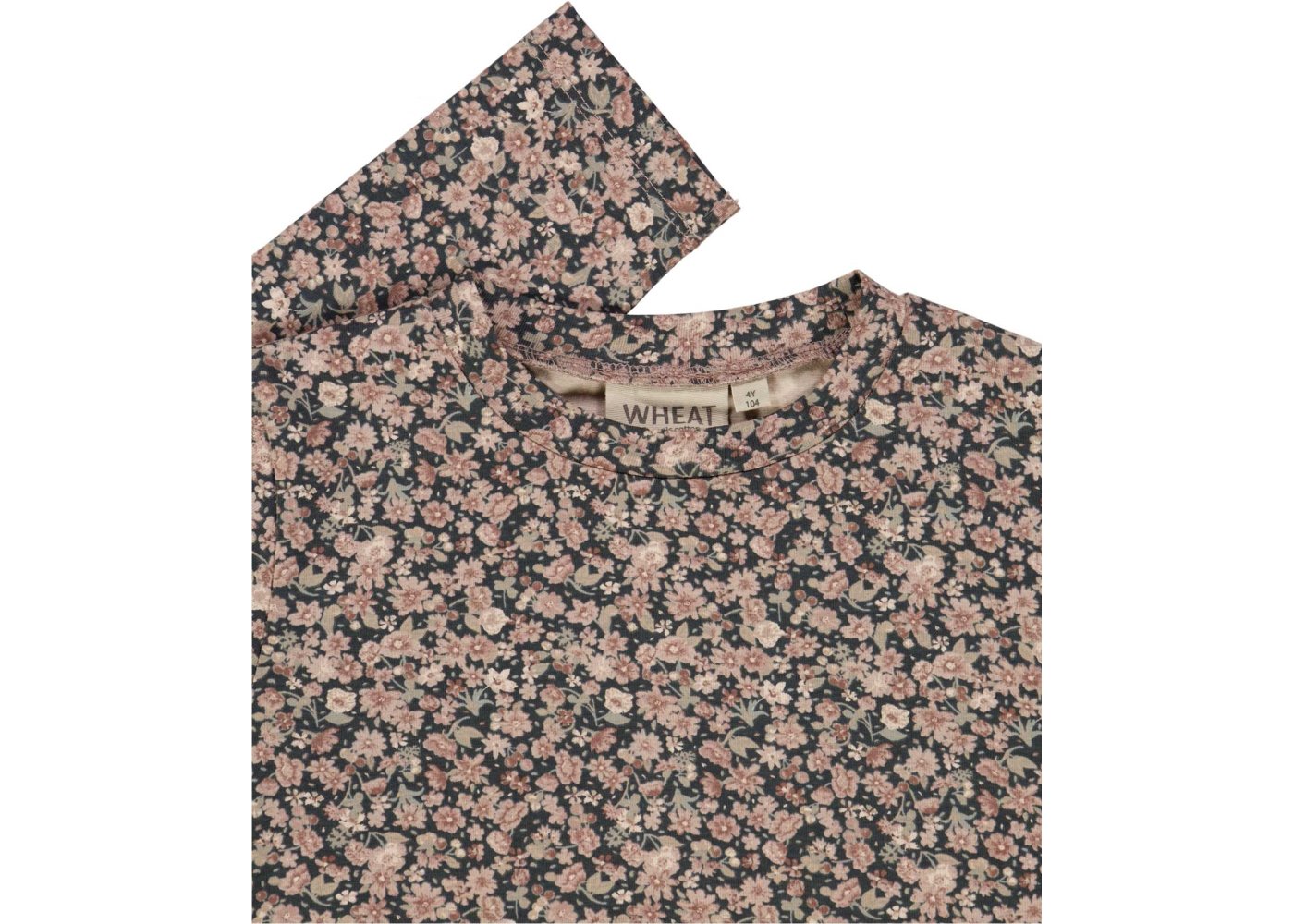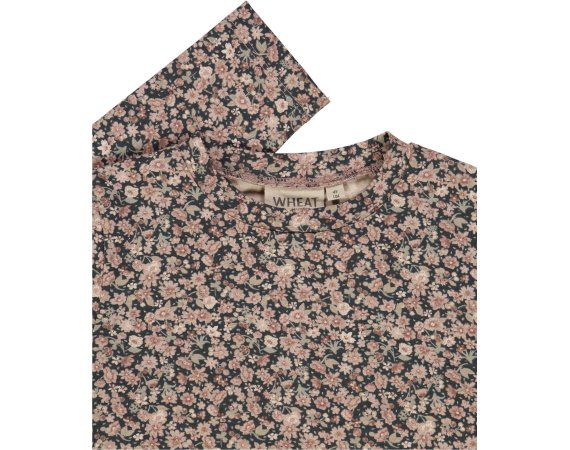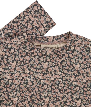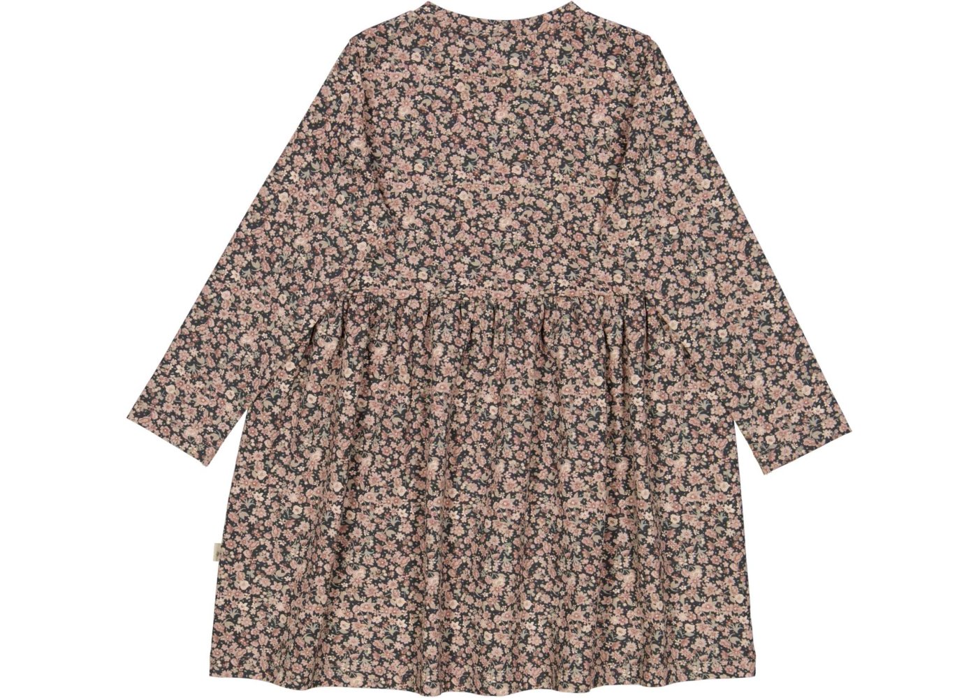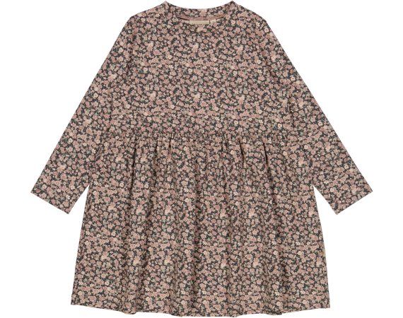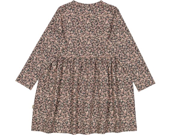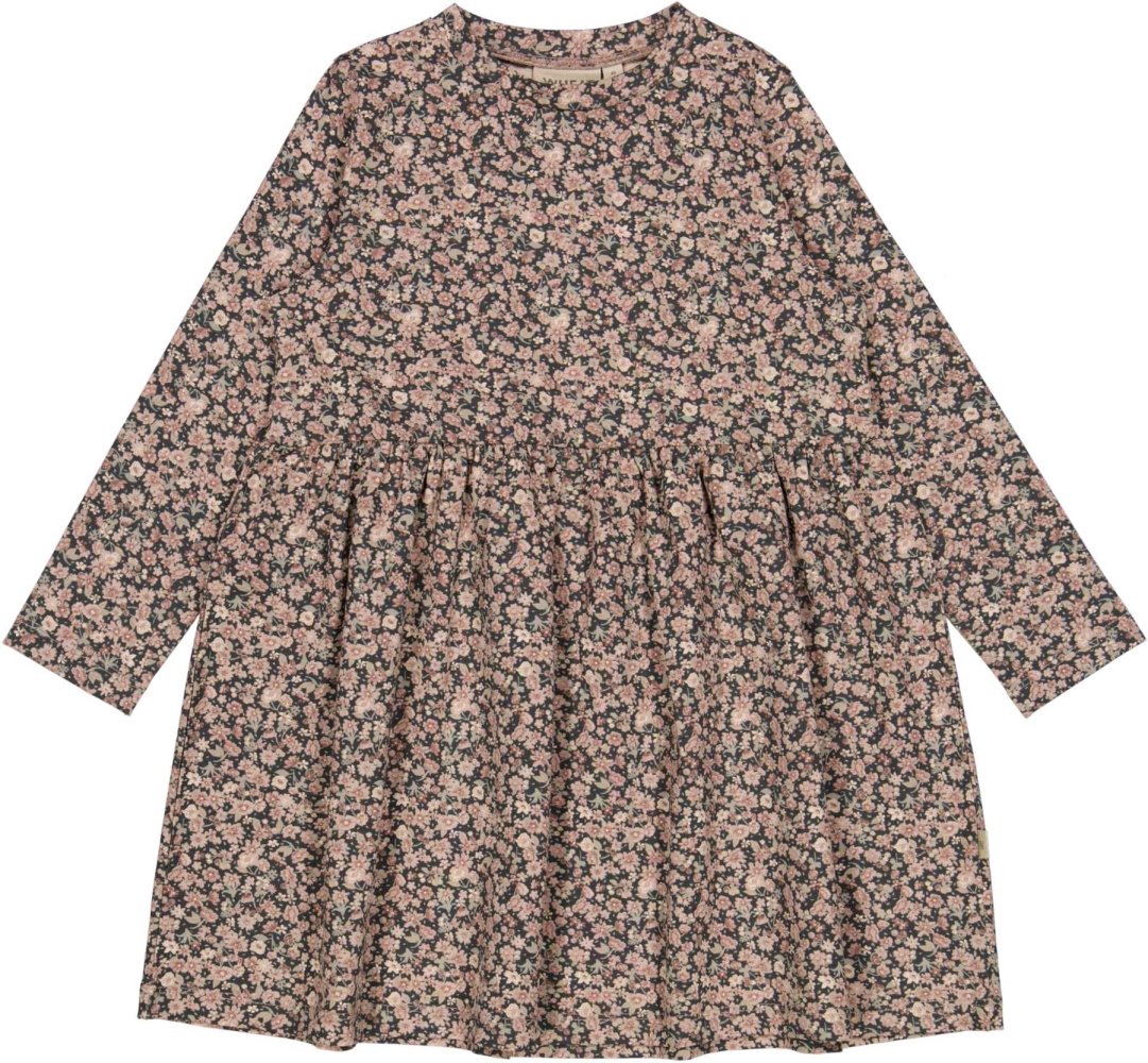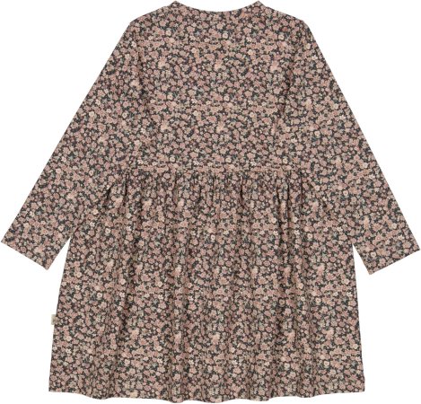 Kjolen har lange ærmer, overskæring i taljen med rynk, der giver skørtet fin vidde.