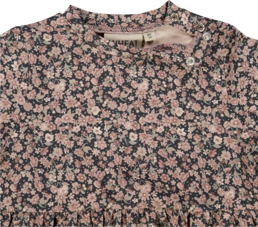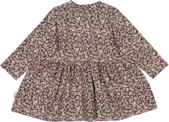 Kjolen har lange ærmer, overskæring i taljen med rynk, der giver skørtet fin vidde.