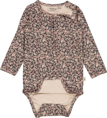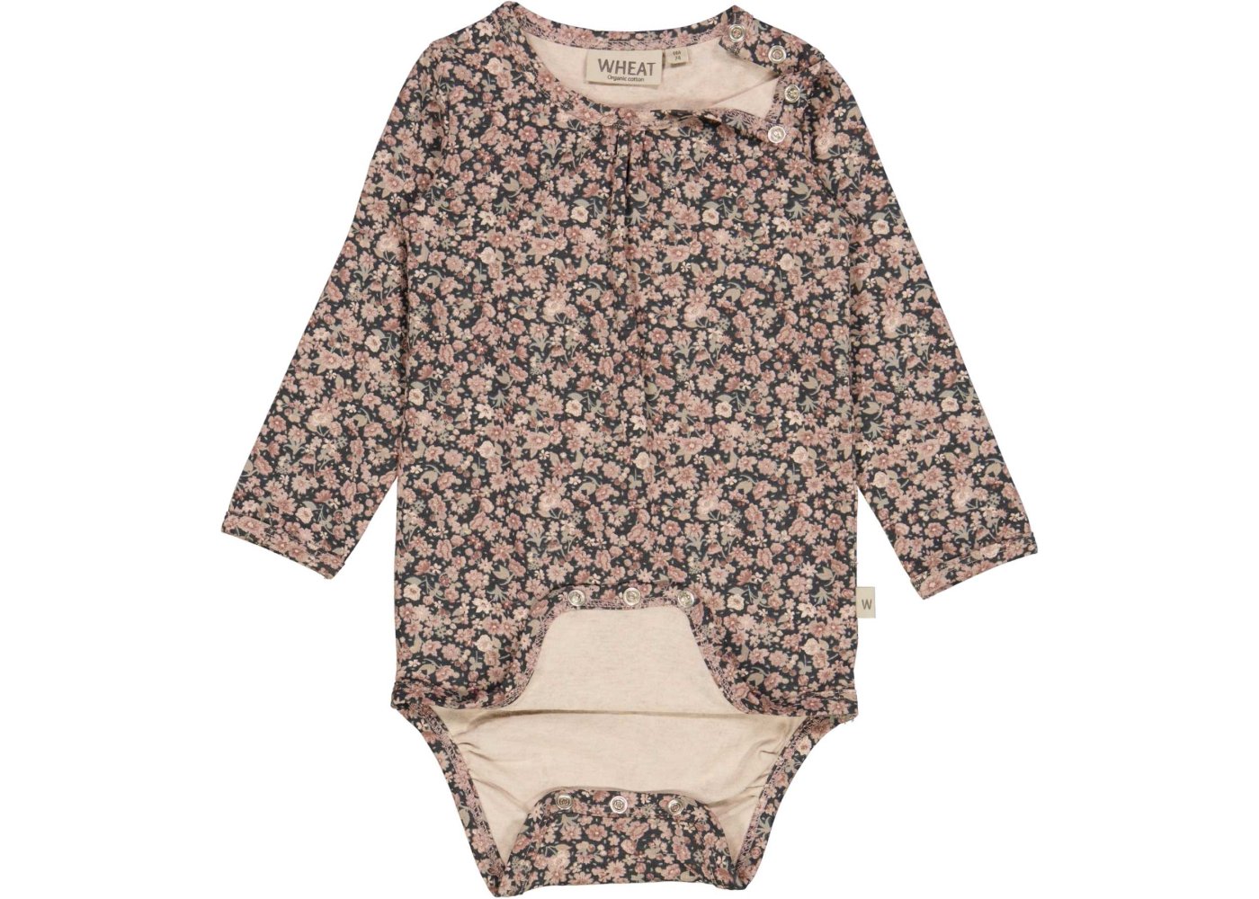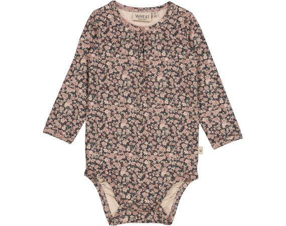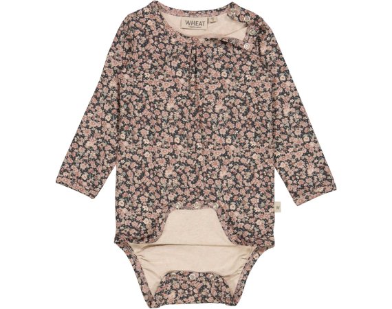 Bodyen har lange ærmer, rynk foran på brystet og ribkanter i alle åbninger. Den lukkes med trykknapper på venstre skulder og mellem ben.