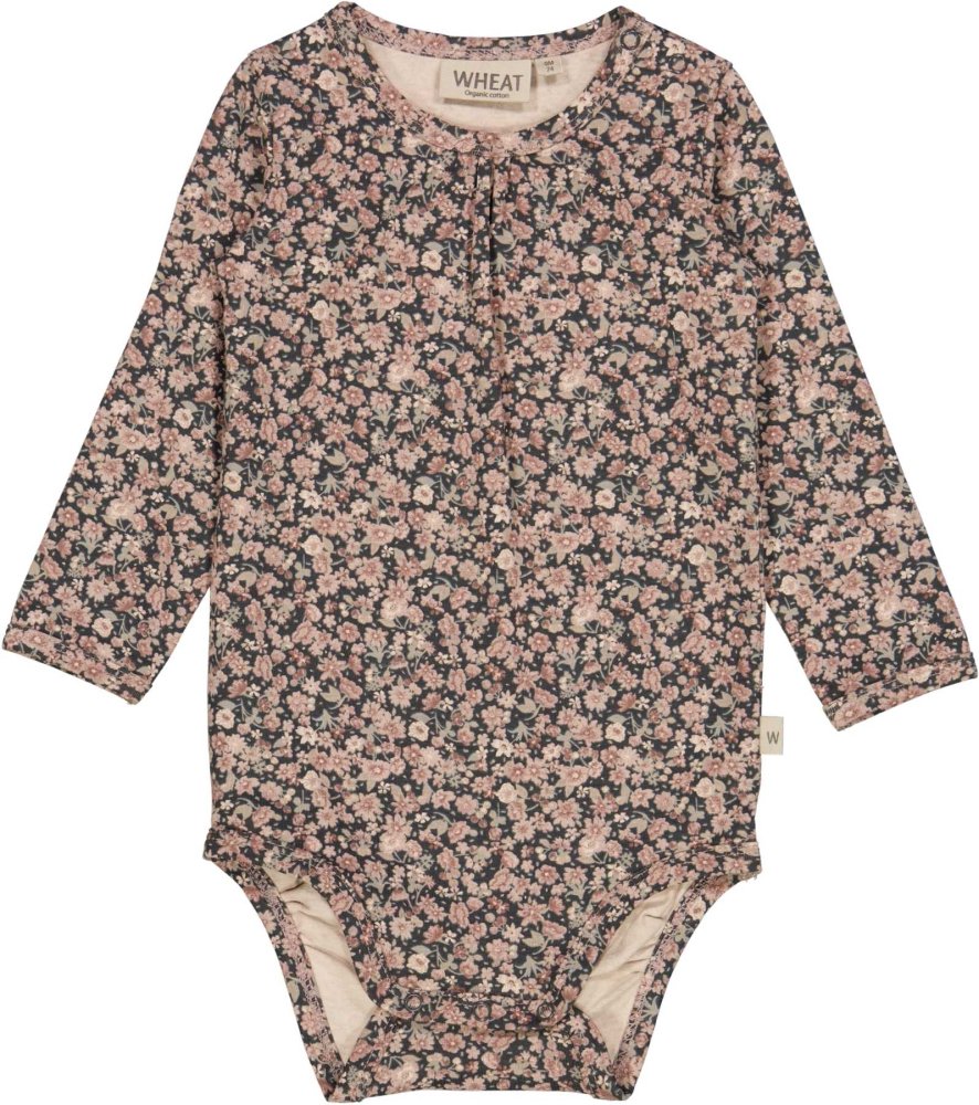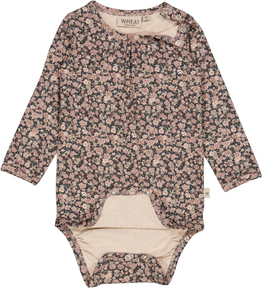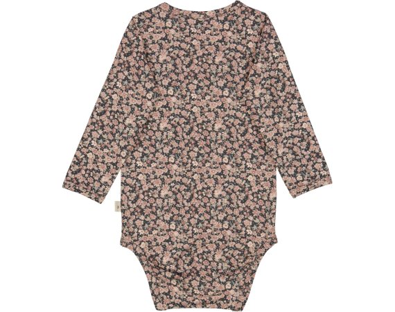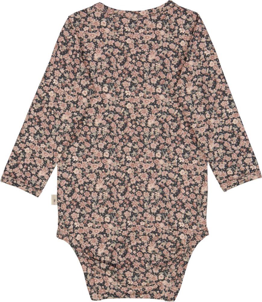 Lækker sort jersey body fyldt med flot håndtegnet blomsterprint i lyse nuancer.