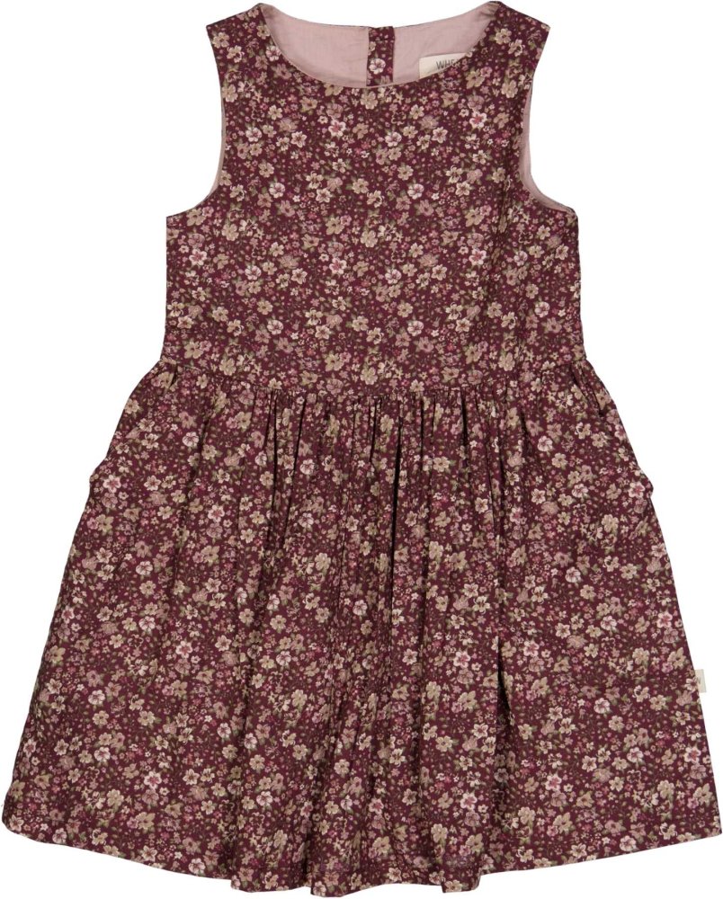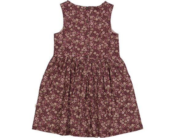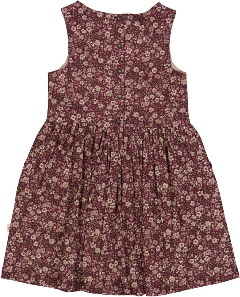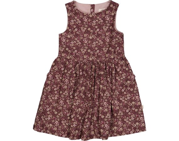 Kjolen er uden ærmer og har rynk i livet, der giver flot vidde til skørtet.