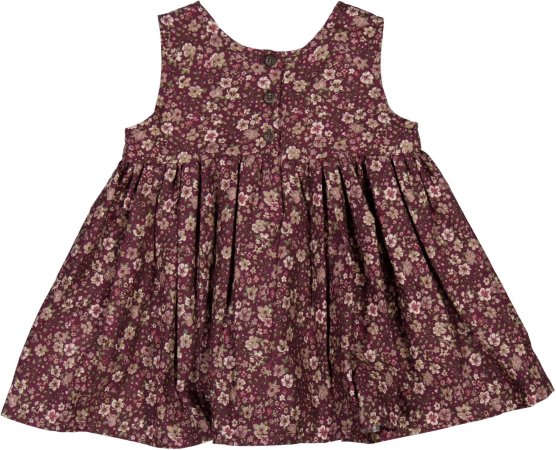Kjolen er uden ærmer og har rynk i livet, der giver flot vidde til skørtet.