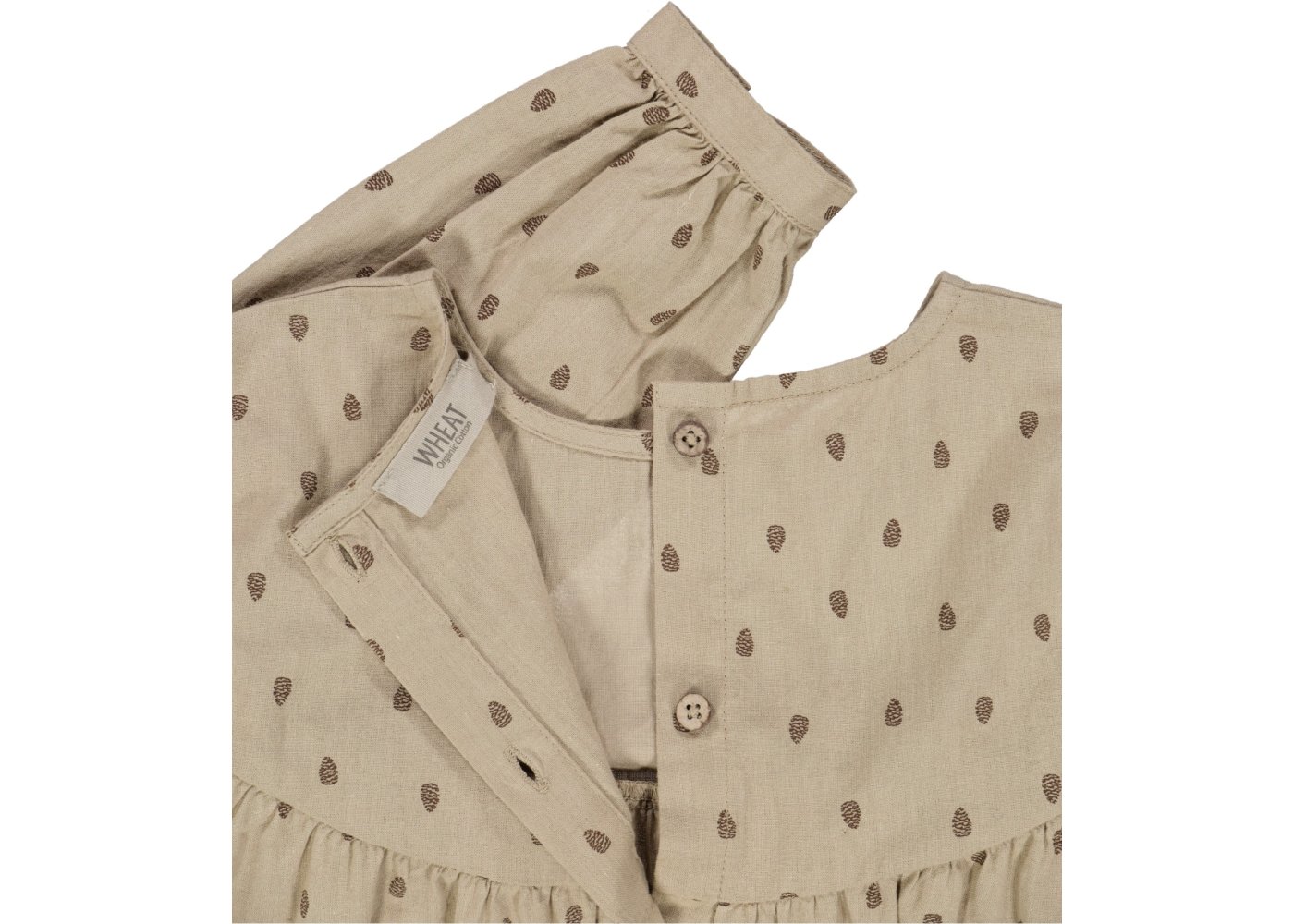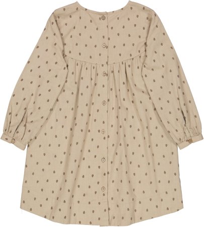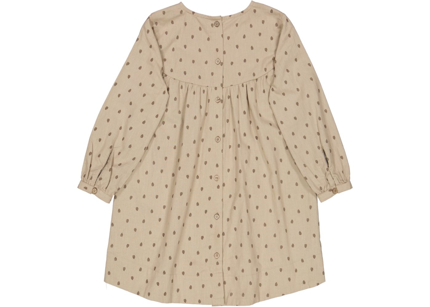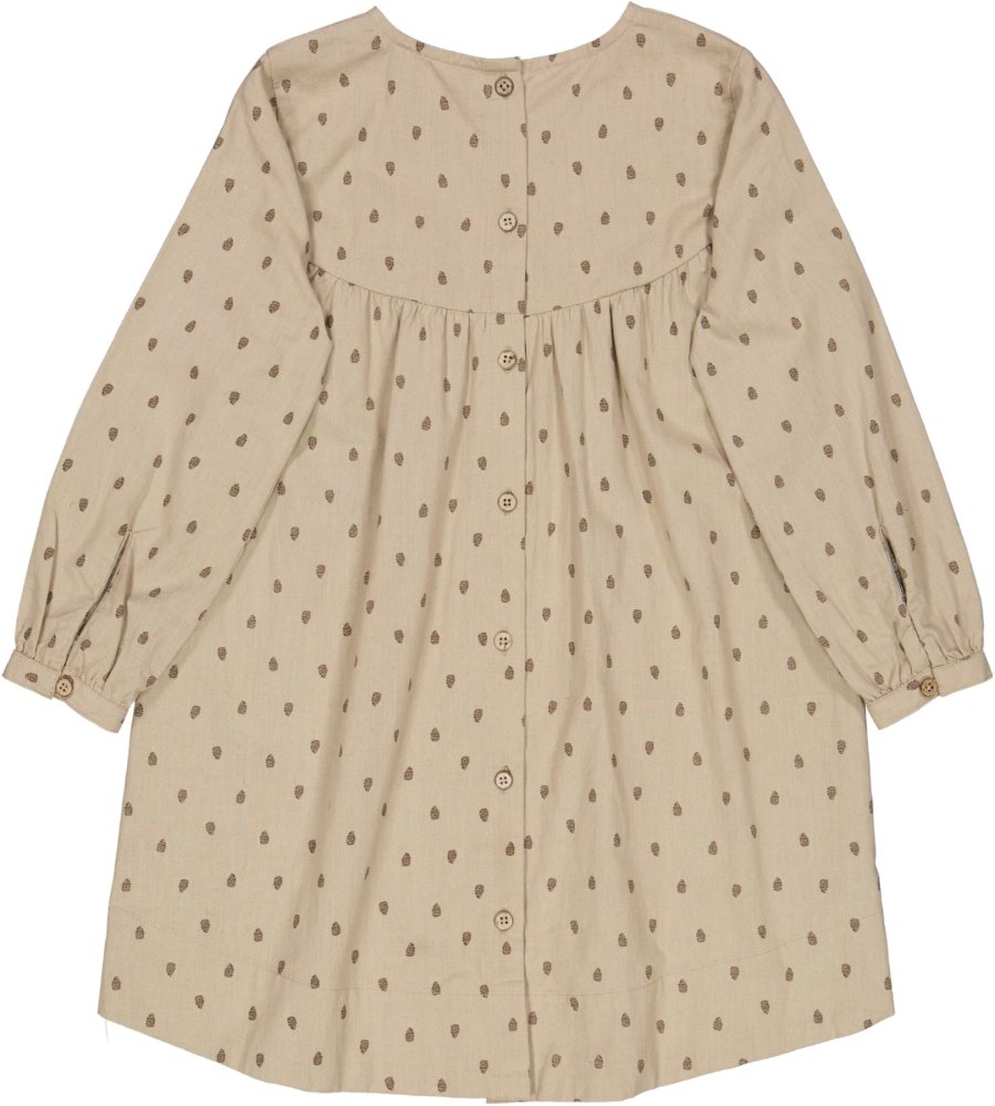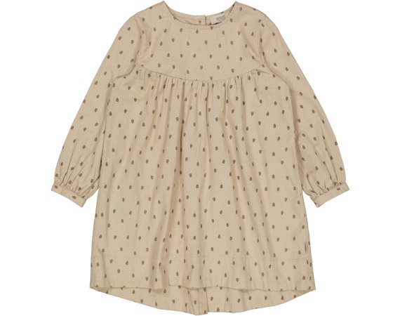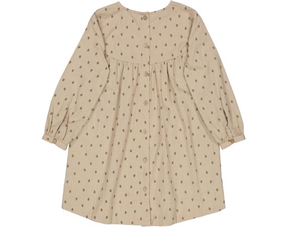 Sød kjole med lange ærmer og længde over knæ. Kjolen har en løs pasform og overskæring med rynk ved brystet. Kjolen er lidt længere bagpå og har gennemgående knaplukning bagpå.