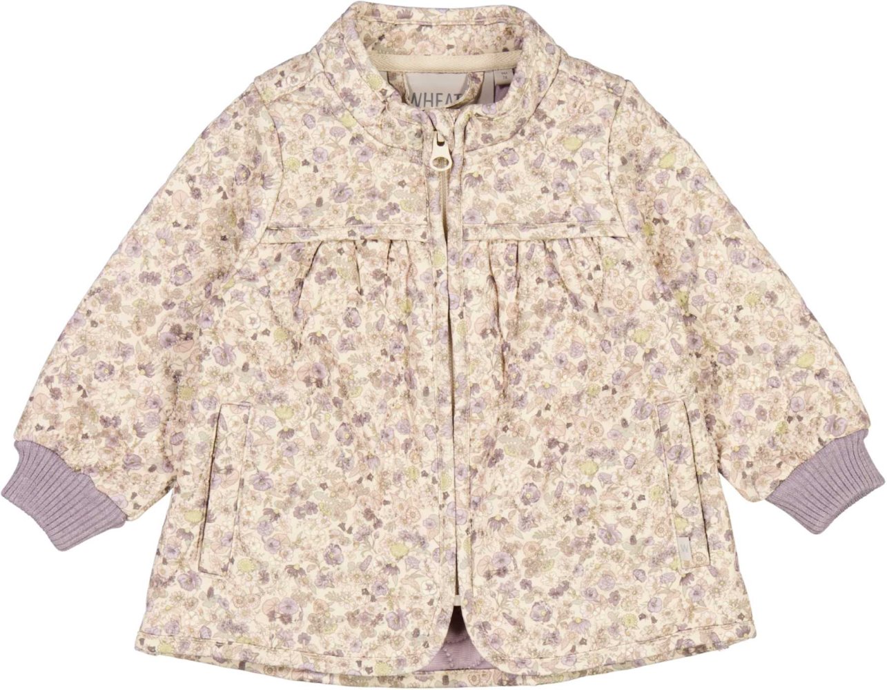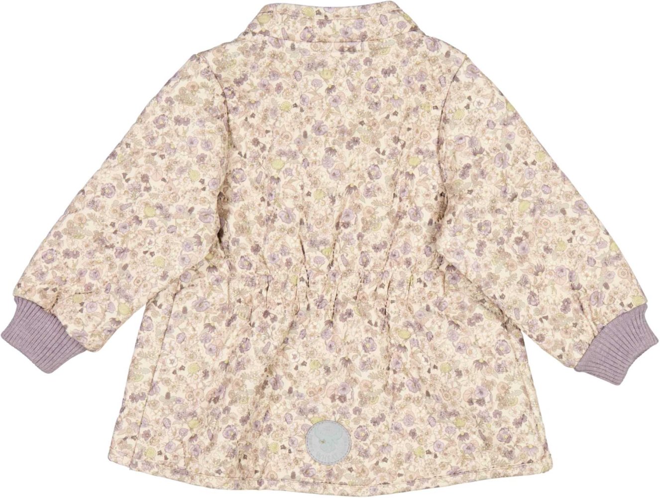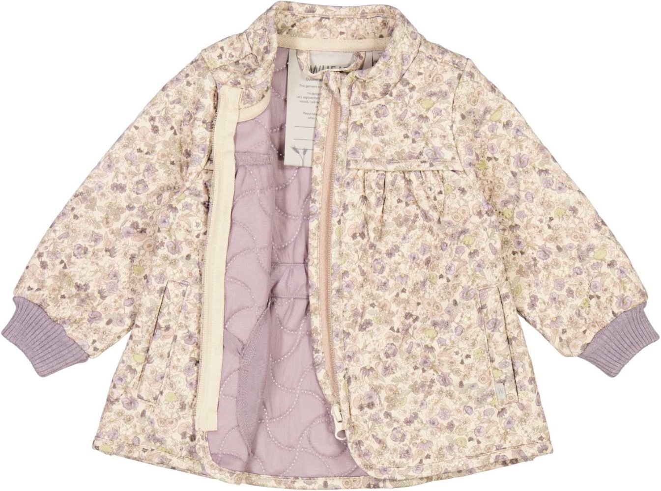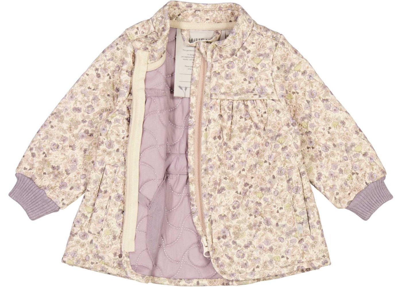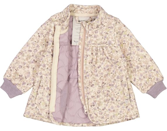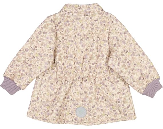 Jakken er A-formet og med fine blomster og ensfarvet rib. Den har kantebånd samt elastik bagpå, der giver jakken et smart look.