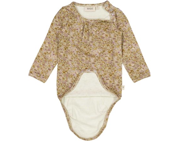 Bodyen har lange ærmer og fint rynk i halsudskæring. Den faste ribkanter i alle åbninger og lukkes med trykknapper på venstre skulder og mellem ben.