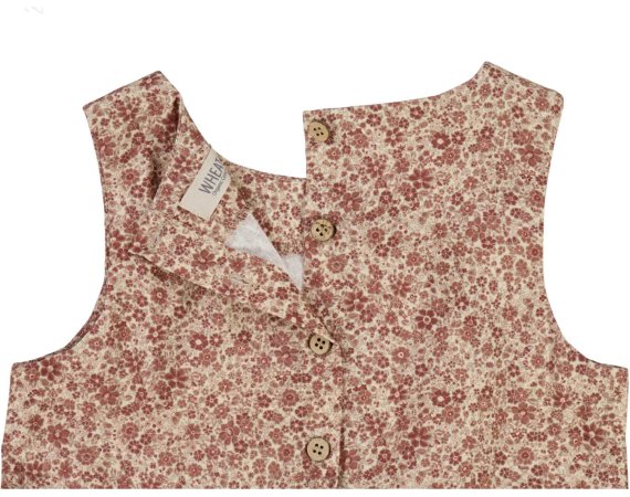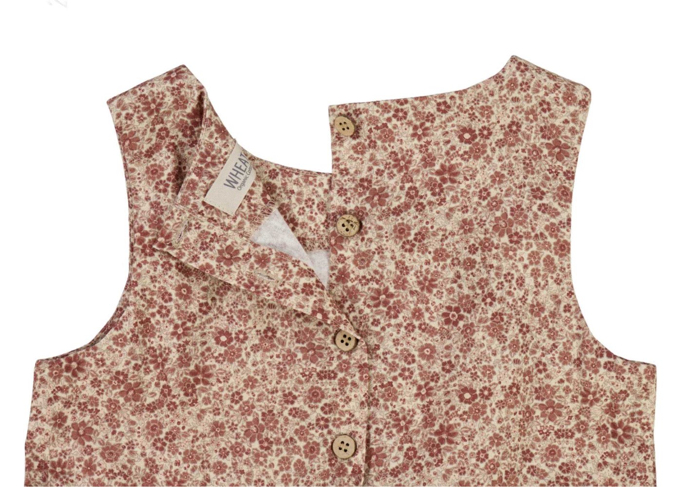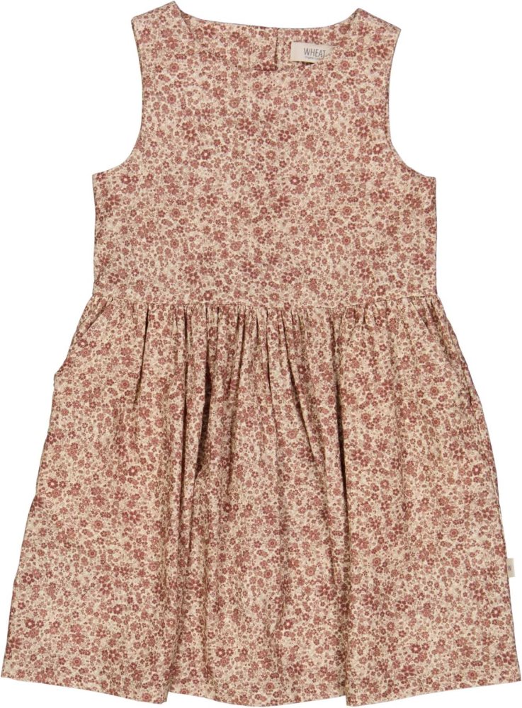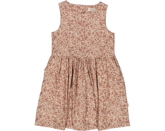 Yndig kjole med håndtegnede håndtegnede blomster og blade fra Wheat.Kjolen er uden ærmer, har sidelommer og et fint rynket skørt med vidde.Den lukkes på ryggen med knapper.