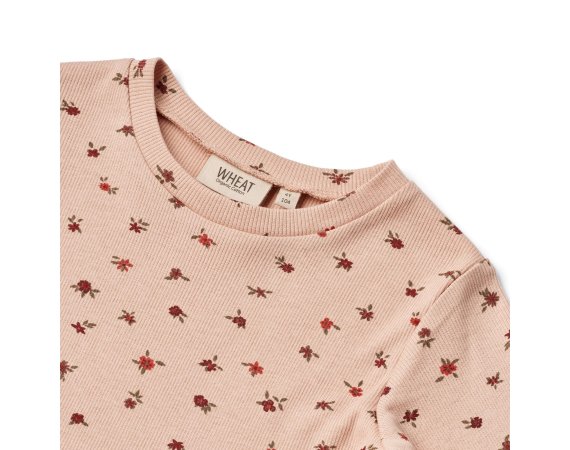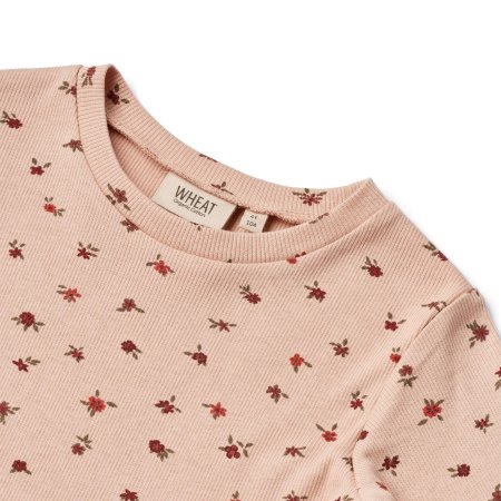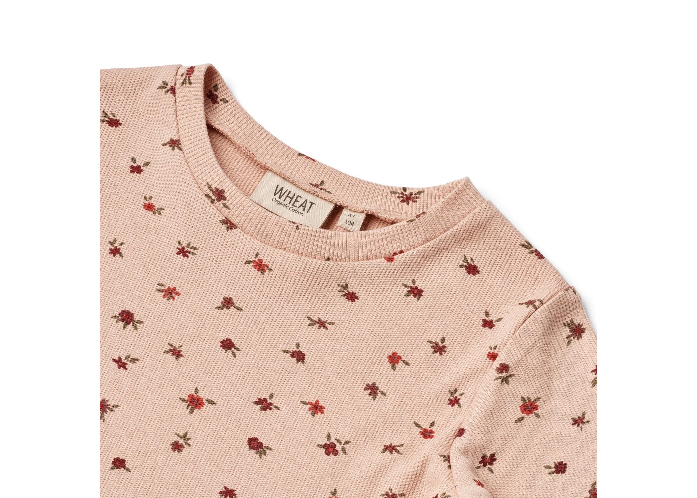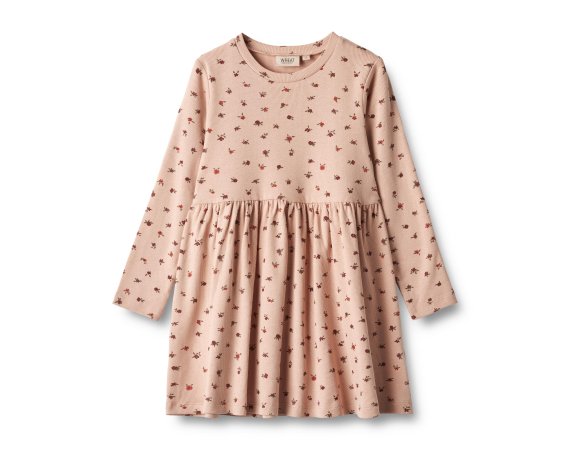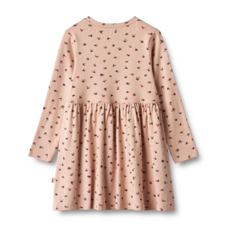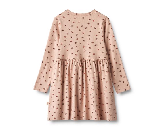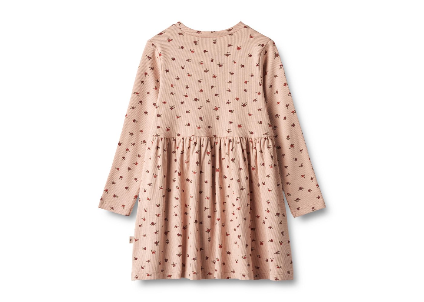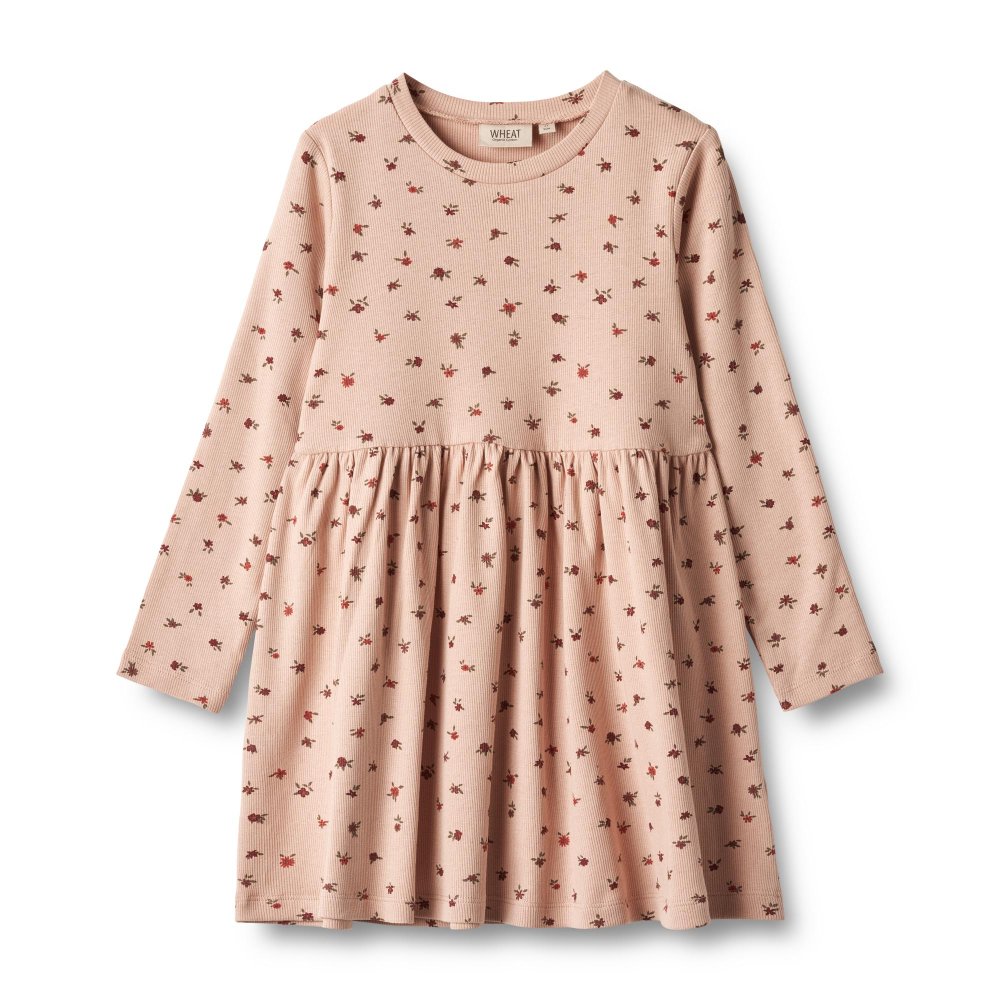 Yndig rosa jersey kjole i ribstruktur med håndtegnet blomsterprint fra Wheat.