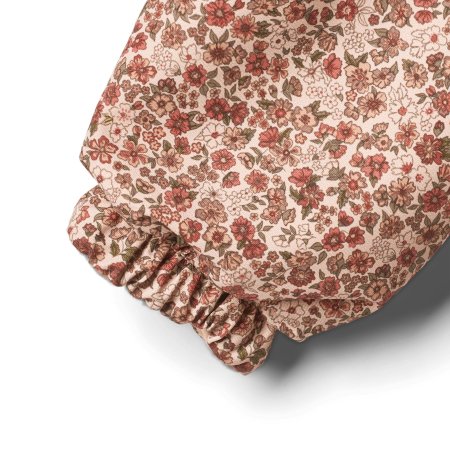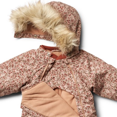 Praktisk varm baby flyverdragt med pelskrave og blomsterprint fra Wheat