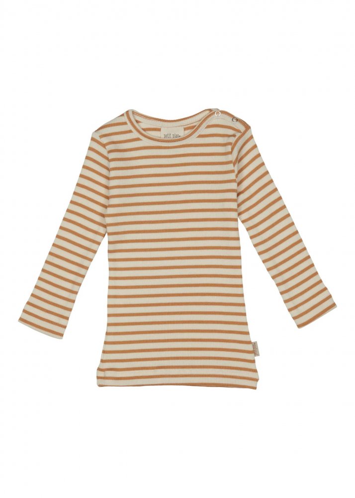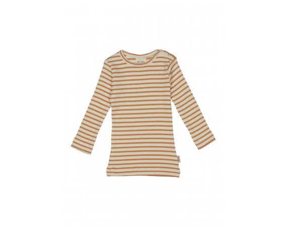 Lækker rib t-shirt i beige med gule striber.Blusen har rund halsudskæring, lange ærmer og lukkes med trykknapper på venstre skulder.