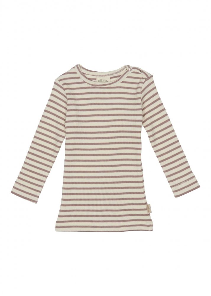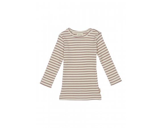 Lækker rib t-shirt i beige med lys lilla striber.Blusen har rund halsudskæring, lange ærmer og lukkes med trykknapper på venstre skulder.