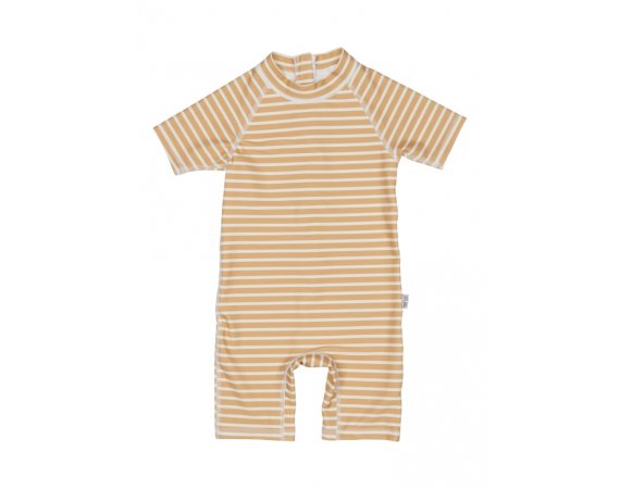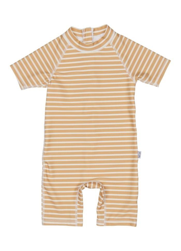Lækker stribet badeheldragt i karrygul og cremehvid farve fra Petit Piao.