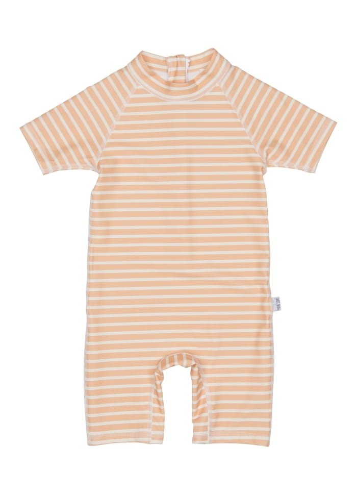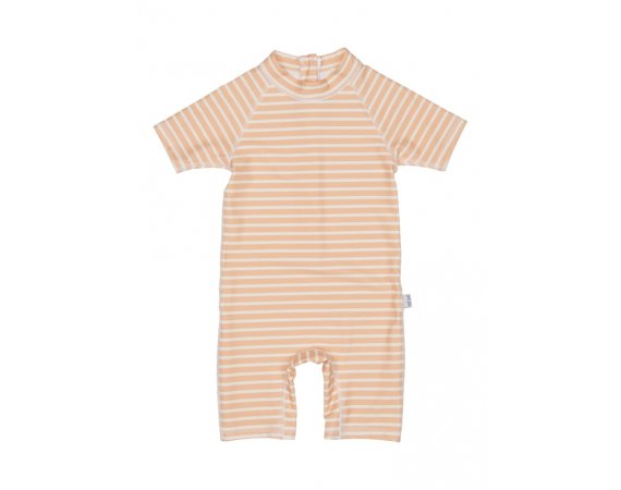 Lækker stribet badeheldragt i fersken og cremehvid farve fra Petit Piao.