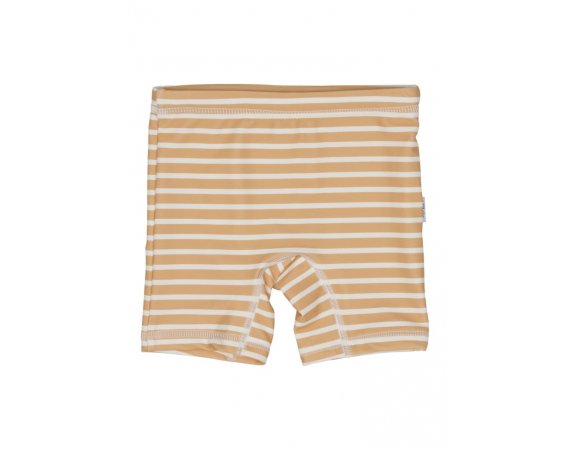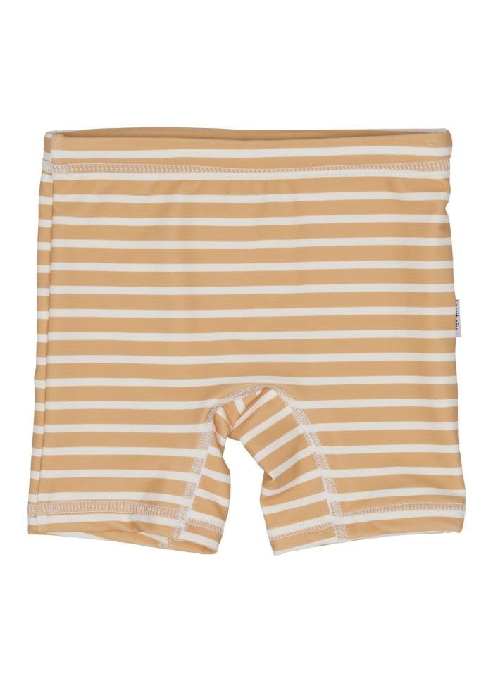 Lækre stribede badebukser i carrygul og cremehvid farve fra Petit Piao.