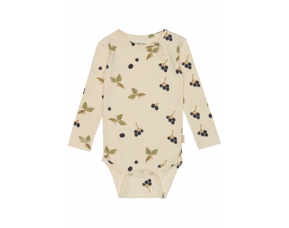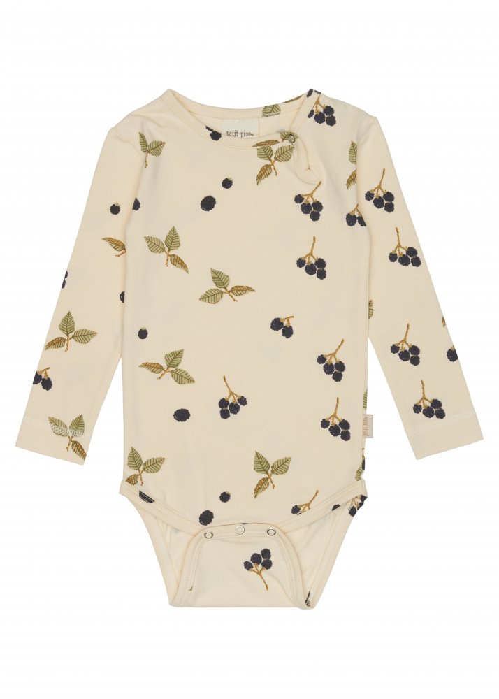 Lækker råhvid body med grønne blade og mørkeblå brombær print fra danske Petit Piao.
