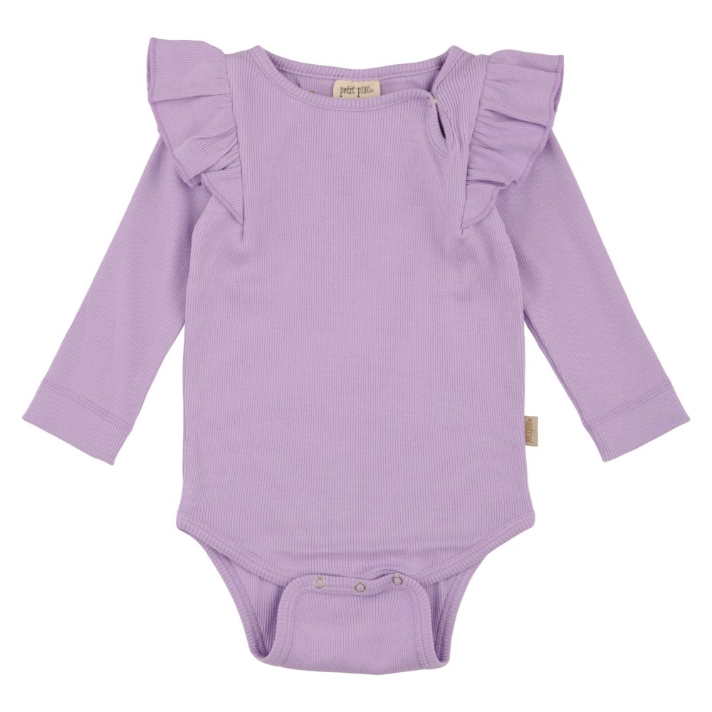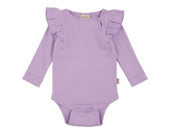 Bodyen har lange ærmer og flæser på skuldre. Den har en fin dråbeformet lukning foran og trykknapper mellem ben.