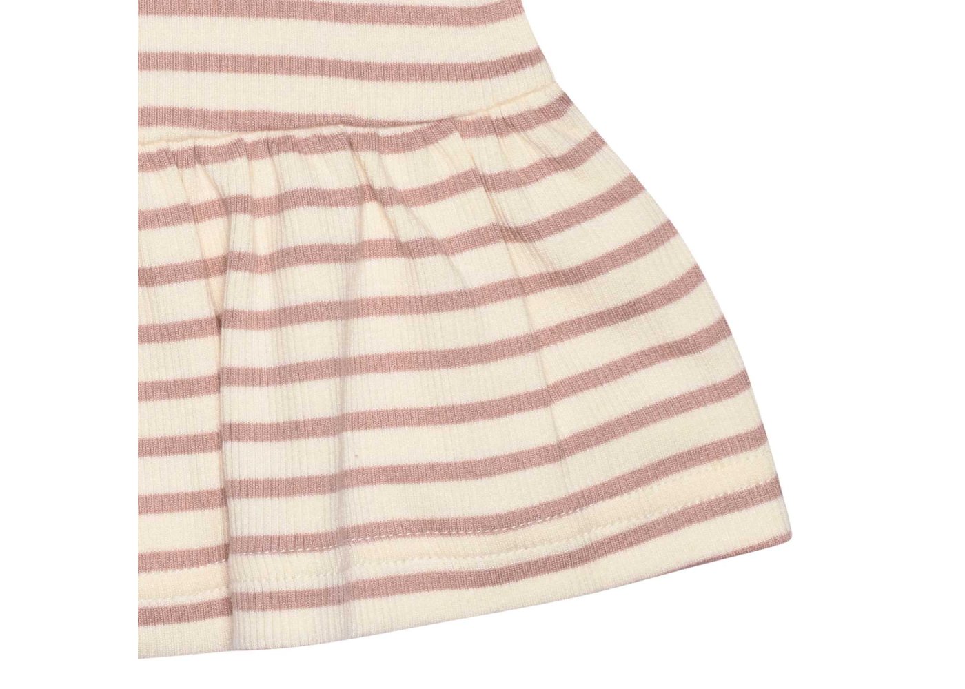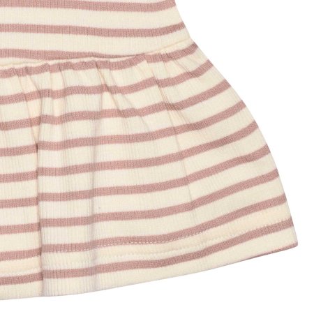 Kjolen har lange ærmer og en dråbeformet åbning med knaplukning i venstre side, der gør det nemt at få den over barnets hoved. Kjolen er fremstillet i en lækker ribkvalitet, der gør den behagelig at have på.