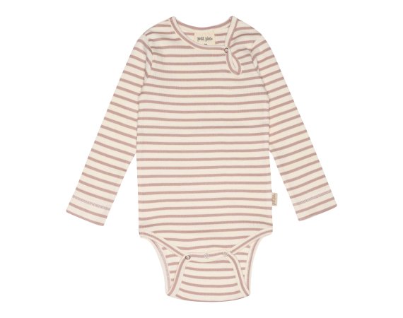 Body med lange ærmer og dråbeformet åbning der lukkes med trykknap, der gør det let at få den over barnets hoved. Bodyen lukkes med trykknapper mellem ben og er fremstillet i en blød bomuld-modal blanding med stræk, der gør den behagelig at have på.