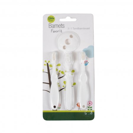 Fint 3 i 1 tandbørstesætTandbørsten til +6 mdr. har gummidutter 360 grader rundt og er beregnet til barnet med begyndende tandfrembrud og ømme gummer.