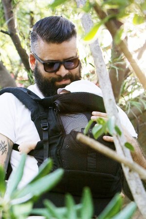 Bæreselen har et spejl, som kan bruges til at holde øje med, at barnet sidder korrekt på ryggen. Den har også en hætte til at skåne barnet for sol, vind og vejr.