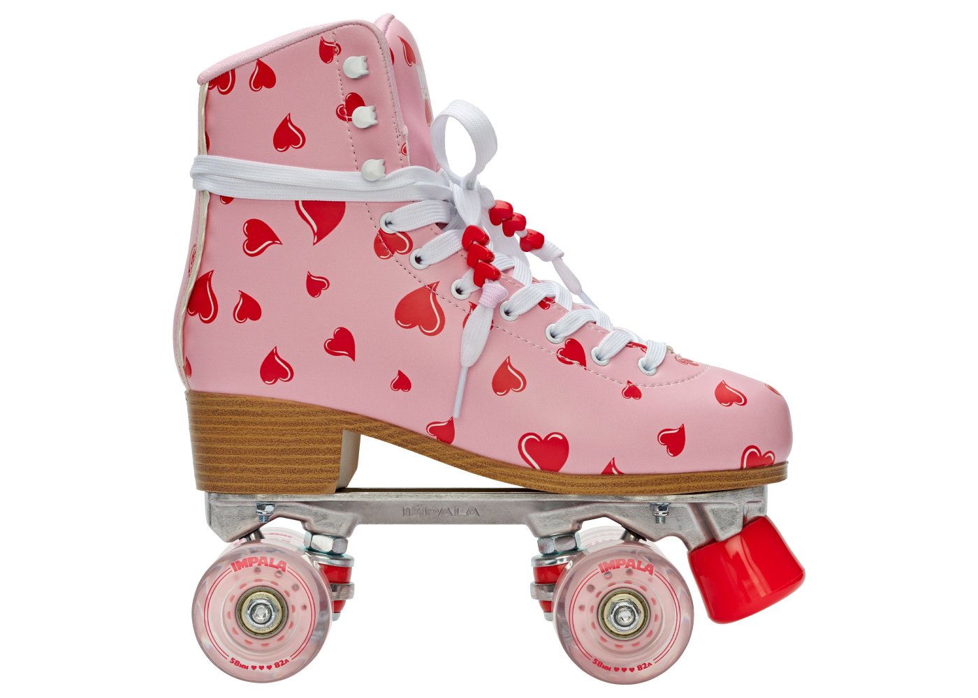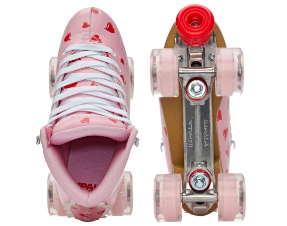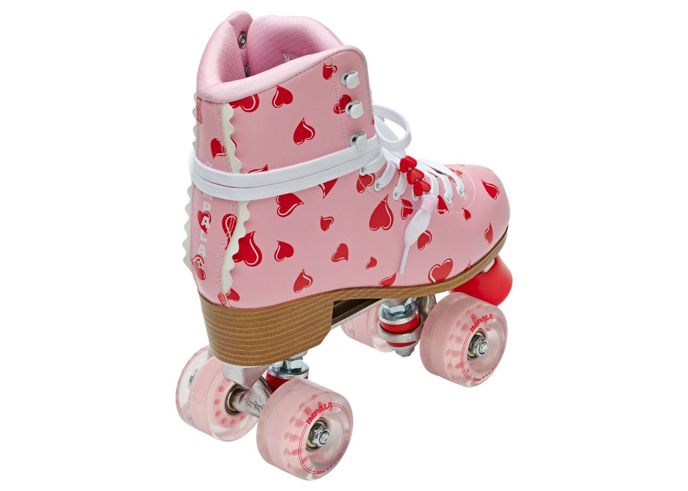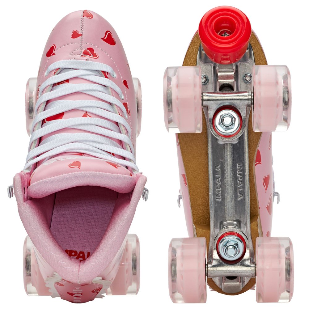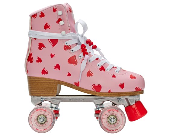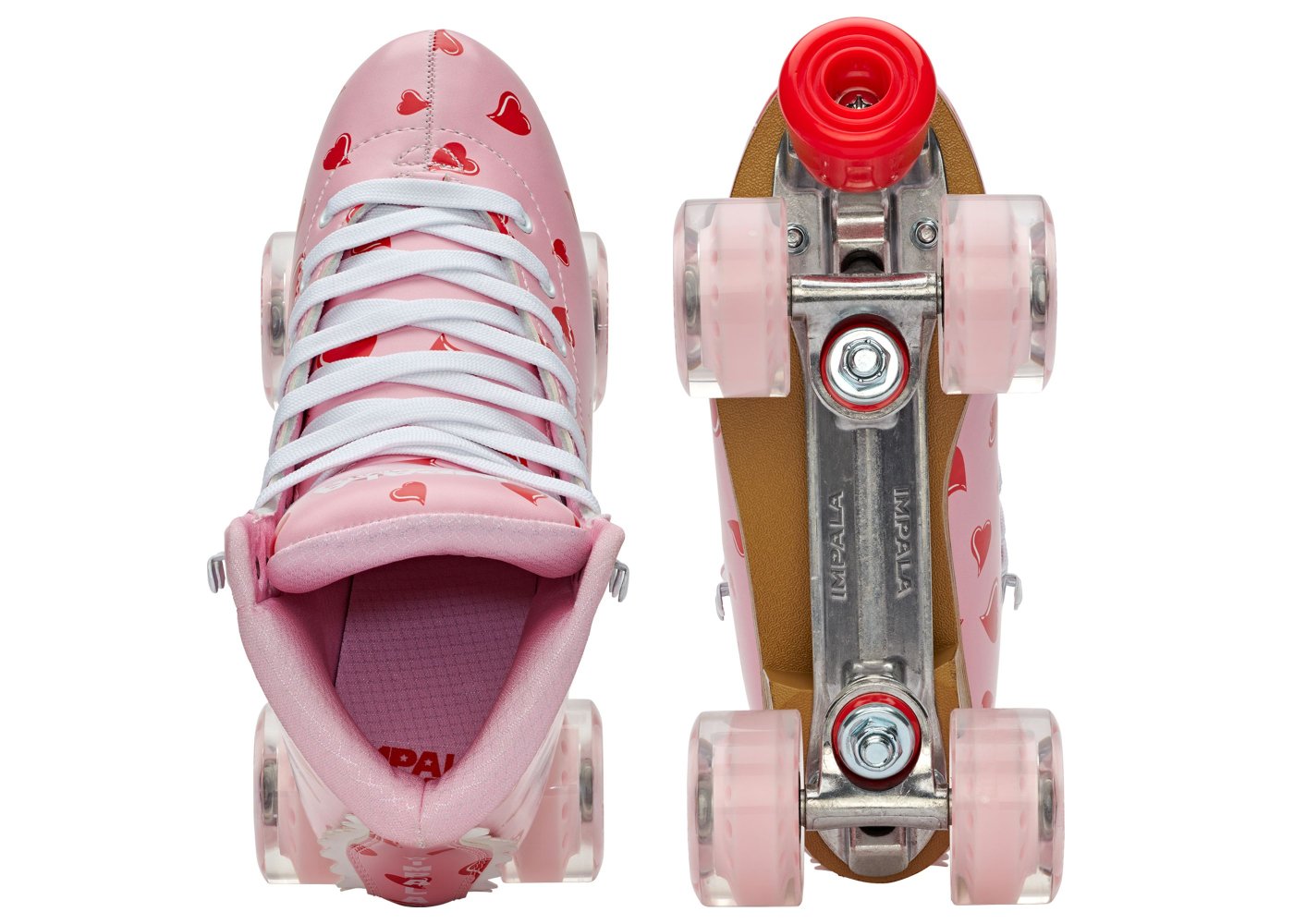Super seje Side-by-side rulleskøjter i rosa med røde hjerter i forskellige størrelser fra Impala.