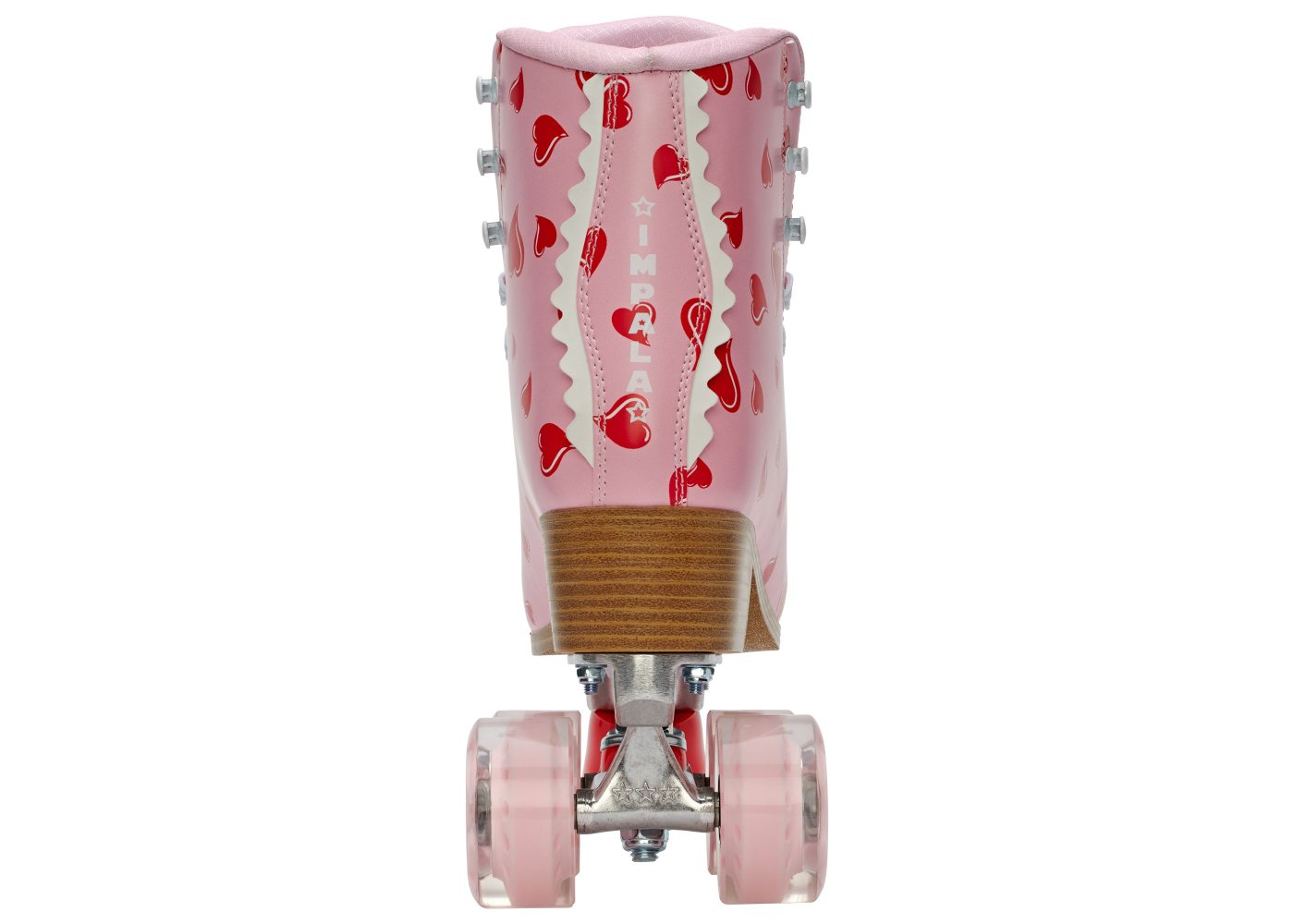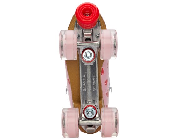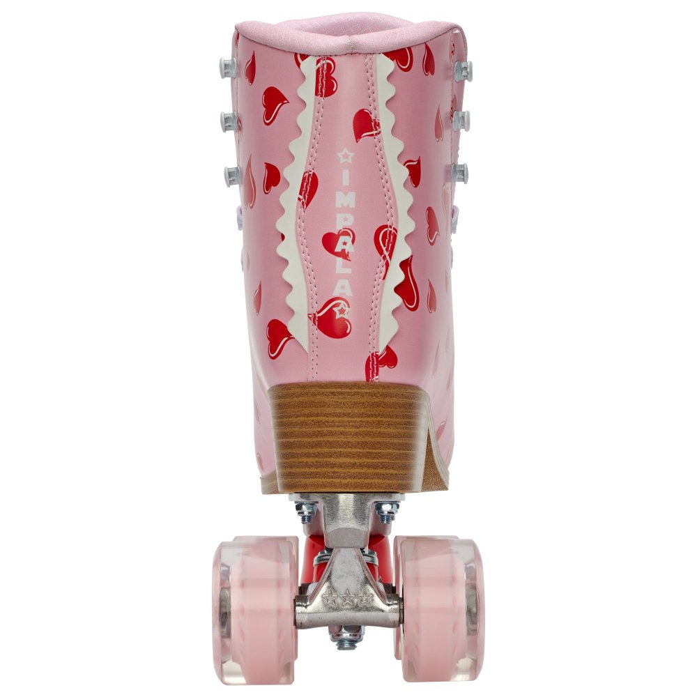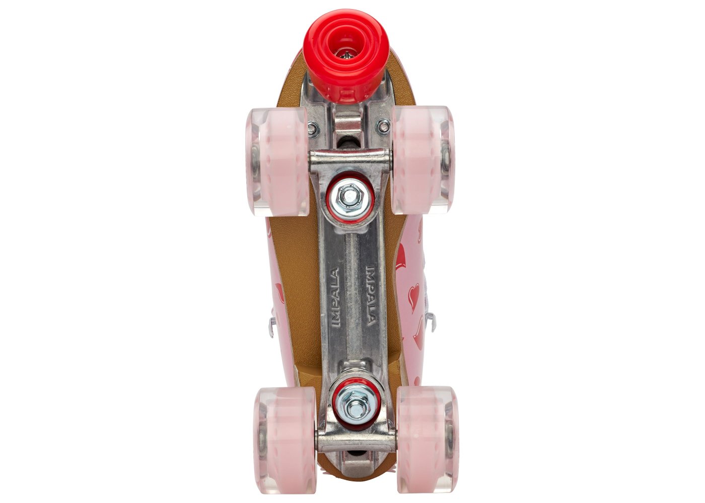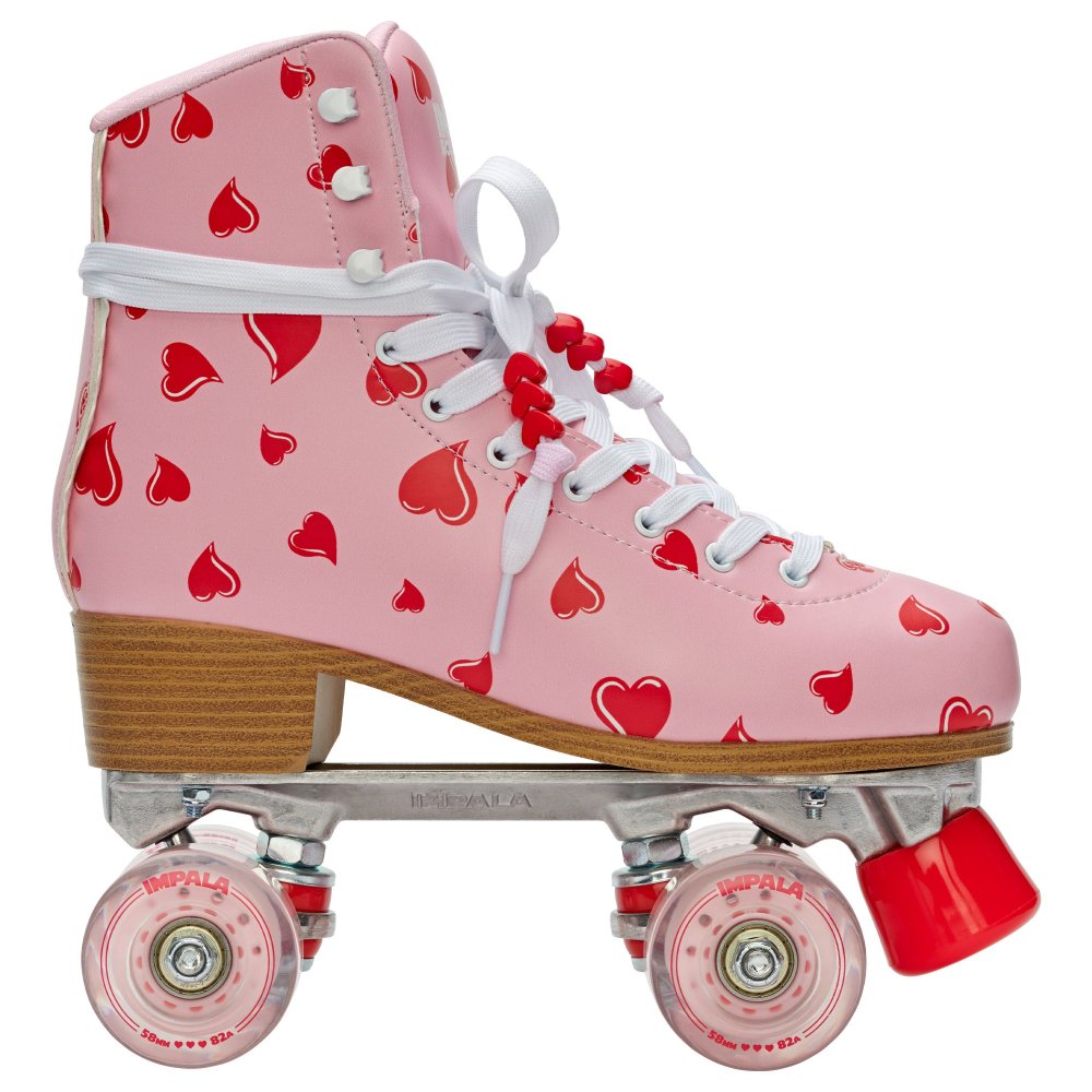 Super seje Side-by-side rulleskøjter i rosa med røde hjerter i forskellige størrelser fra Impala.